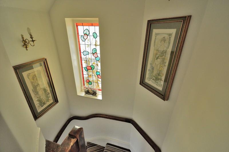LANDING: Carpet. Wooden hand rail. Stained glass window to side aspect. Loft hatch. Picture rail. Doors to all rooms.