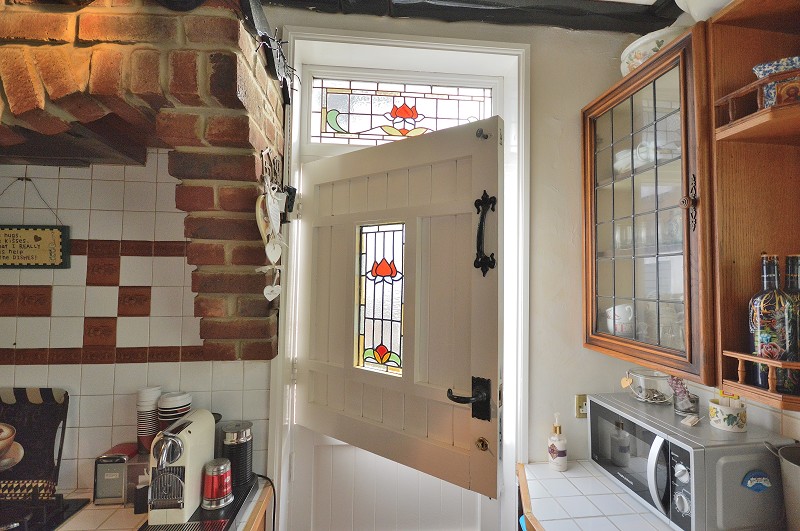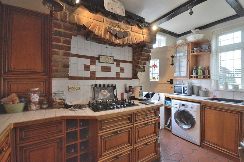 KITCHEN: Terra cotta tiled flooring. Fitted wooden wall and base units. Integrated Neff double oven (untested). Integrated hob (untested) with brick feature, extractor fan overhead and tiled splash back. Sink with mixer tap. Tiled work top and partly tiled walls. Plumbing for washing machine. Plumbing for dishwasher. Space for fridge/freezer. Ceiling beams. Feature stable door to rear garden with stained glass inset and above.