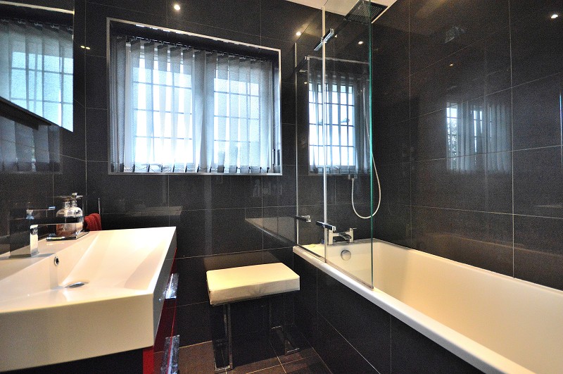 BATHROOM: Fully tiled walls. Bath with tiled side panel and mixer taps. Glass shower screen. Fixed thermostatic waterfall shower. Vanity unit with large modern basin and mixer taps. Chrome towel rail. Spotlights. UPVC double glazed window to side aspect.