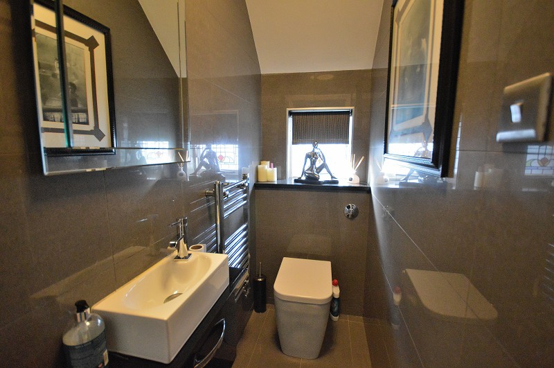 SEPARATE W/C: Tiled flooring and fully tiled walls. Vanity unit with wash basin with mixer tap. Concealed cistern W/C. Chrome towel rail. Stained glass window to side aspect.