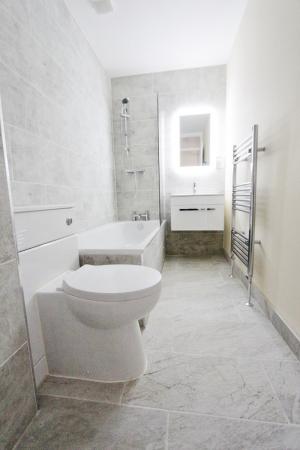 Newly refurbished bathroom with touch sensor mirror and wall hung wash hand basin with cabinet.