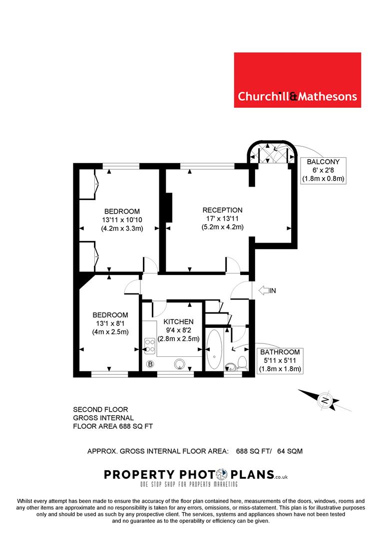 The property comprises of Entrance Hall, Lounge with dining area, Kitchen, Two Double Bedrooms, Bathroom and Balcony. The total floor area is approximately 688 SQ/FT (64 SQ/M)