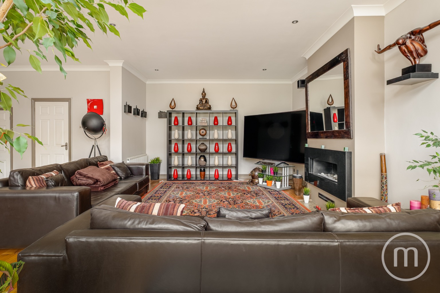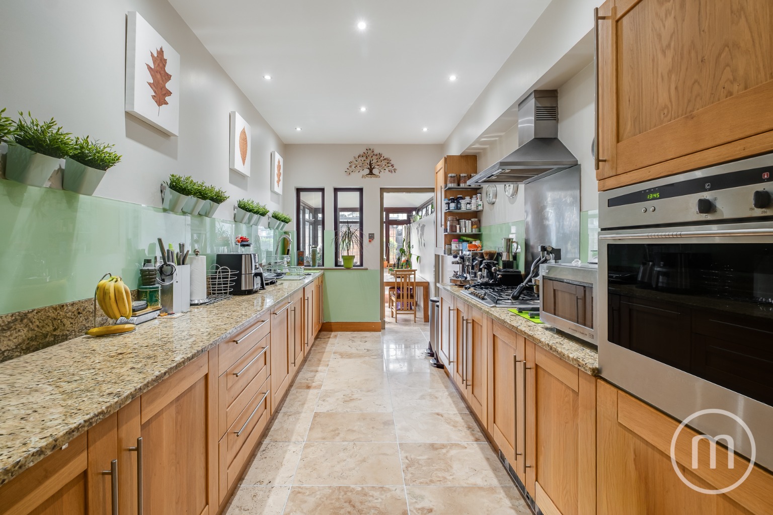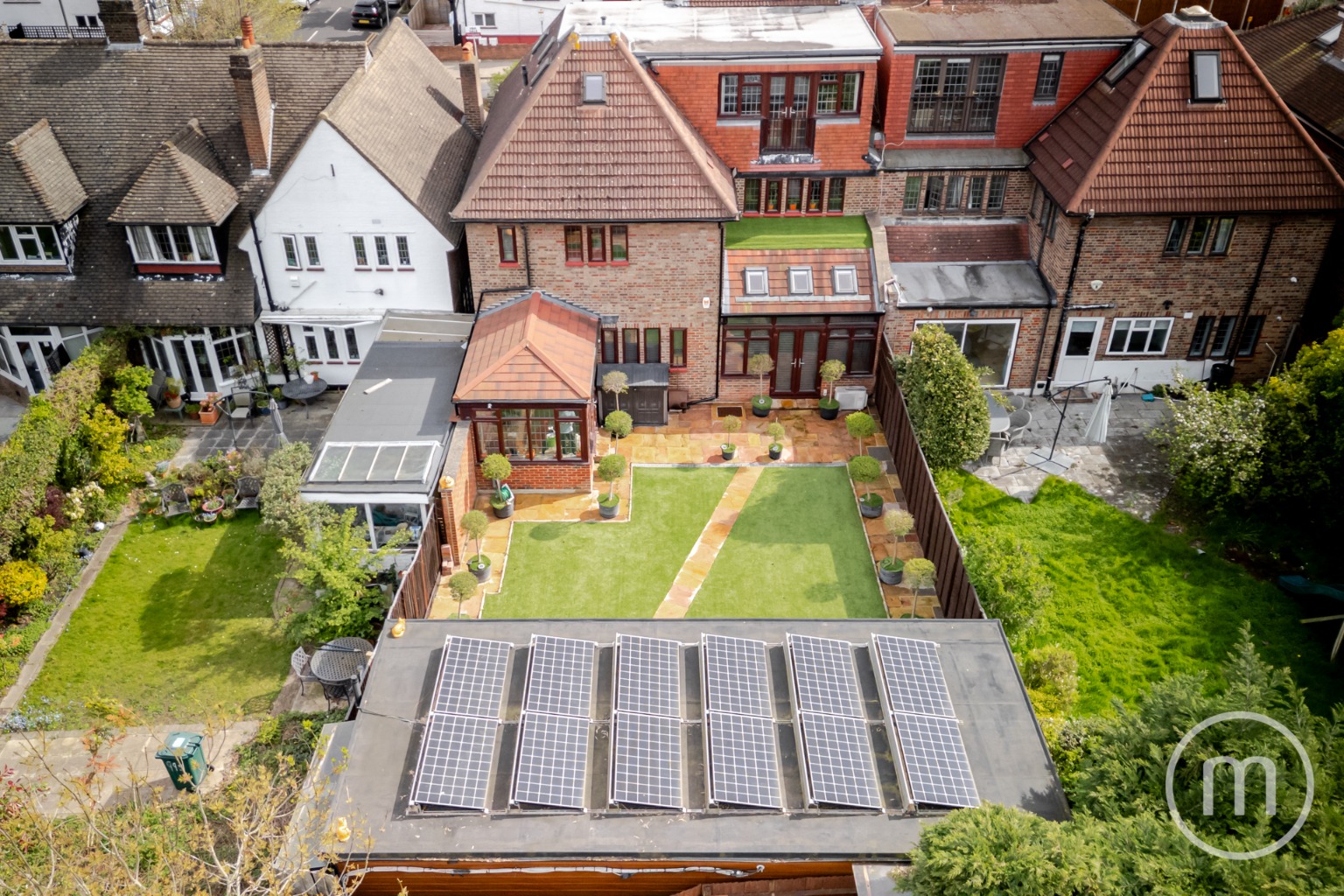 Comprising a large reception hall with guest WC, a front reception room/office, and a 24’ x 23’ double reception room at the rear. There is also a 19’ kitchen with integrated appliances leading to a conservatory/breakfast room.
