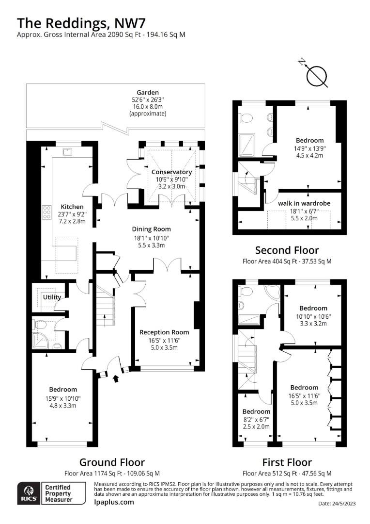 The first floor boasts a large master bedroom which includes a full length wall of wardrobes, another double bedroom with built in wardrobes and a further single bedroom. There is a good sized family bathroom. On the top floor is a further double bedroom, walk in wardrobe and bathroom.