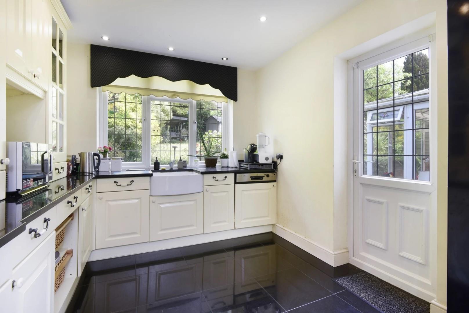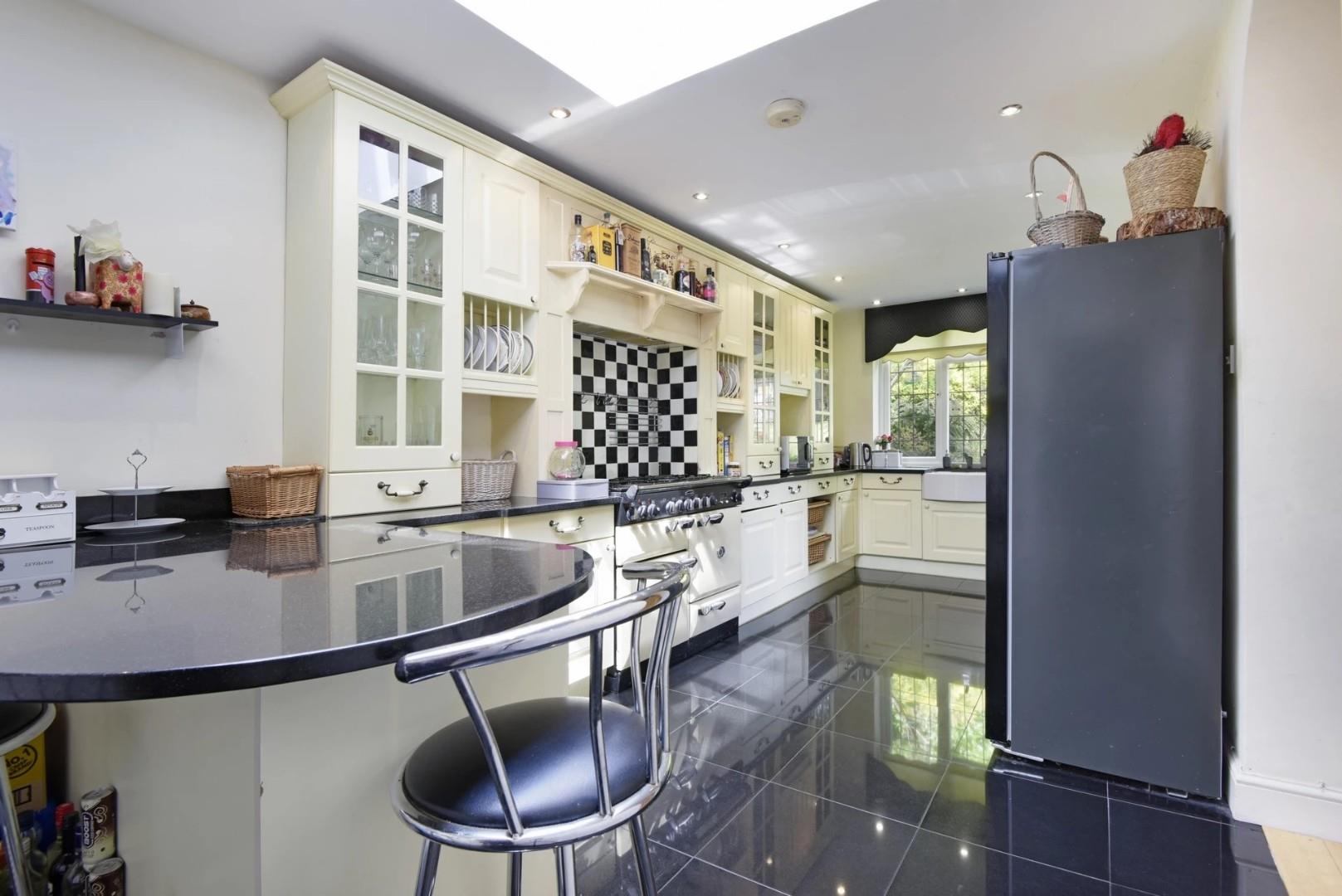 There is a further reception room with a traditional style gas fireplace and surround, and bay windows overlooking the driveway. There are French doors leading into a large dining room with a modern gas fireplace with a lovely view overlooking the garden with doors accessing a charming conservatory. Further French doors from the dining room take you into the spacious fully appointed kitchen which has a breakfast bar and granite worktops. The kitchen has direct access onto a well-kept garden.