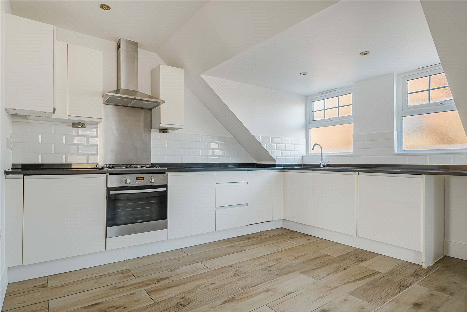 The spacious kitchen/living area is ideal for relaxing or entertaining, with large windows that fill the space with natural light. The sleek, modern kitchen is fitted with contemporary units and integrated appliances, creating a stylish and functional cooking space.