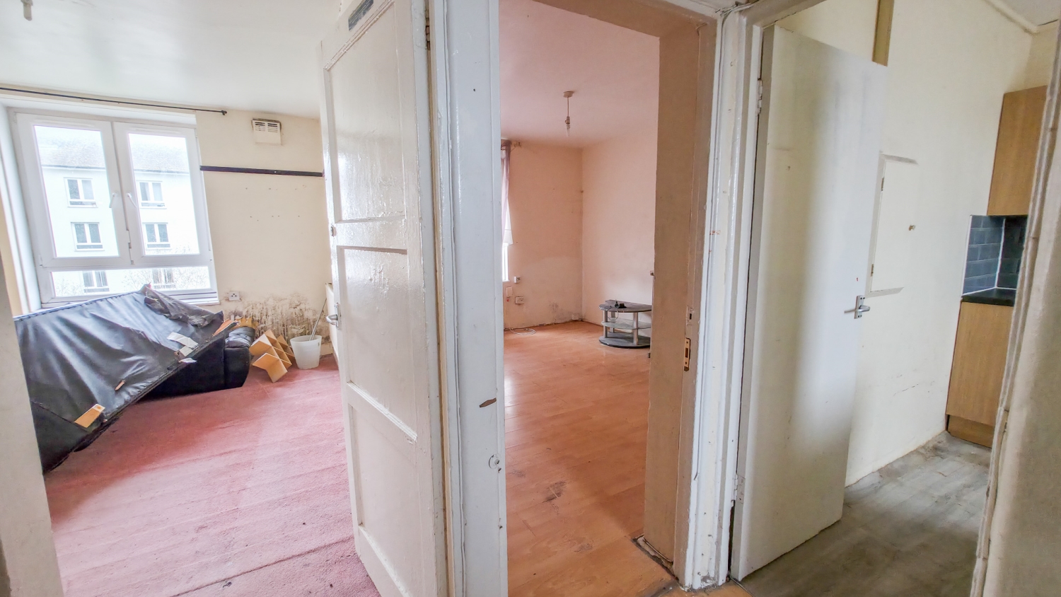 The accommodation comprises a welcoming entrance hall, a combined lounge/kitchen area, two spacious double bedrooms, a third single bedroom (ideal as a study or guest room), a family bathroom, and a separate WC. The layout offers flexibility and solid potential for refurbishment to suit a variety of needs.