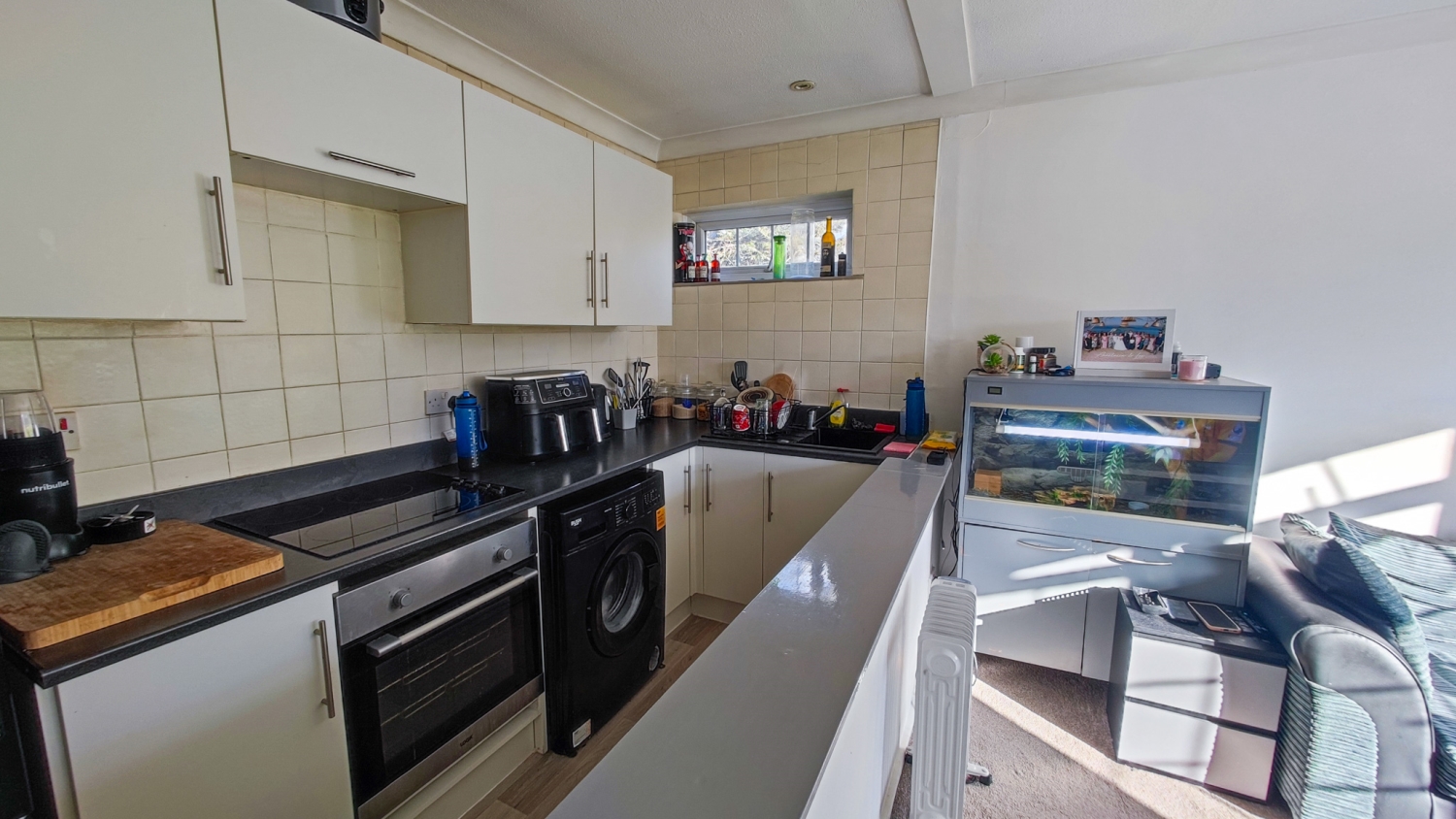 Well-Equipped Kitchen: A fully fitted kitchen with storage and modern appliances, providing the ideal space for home cooking.