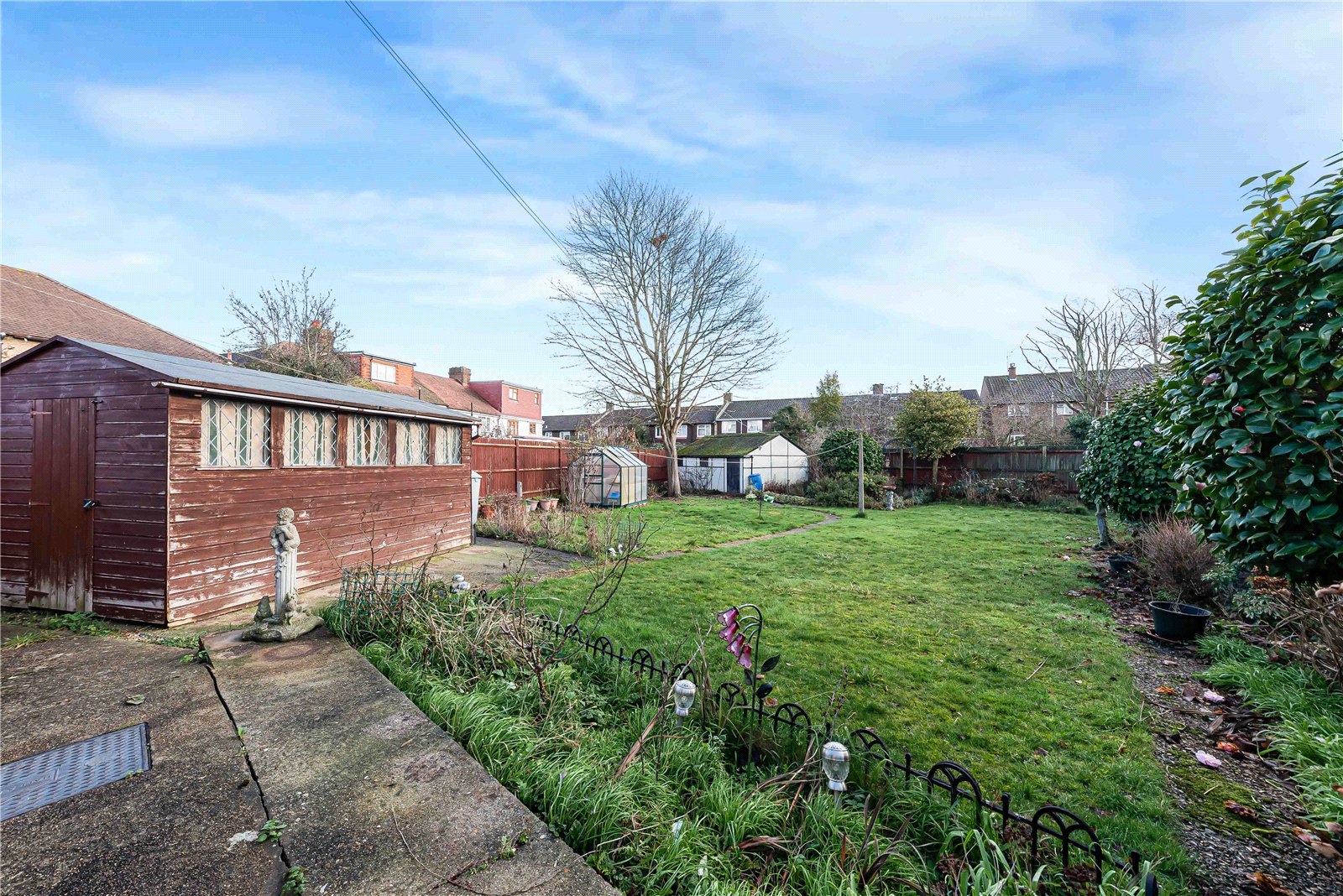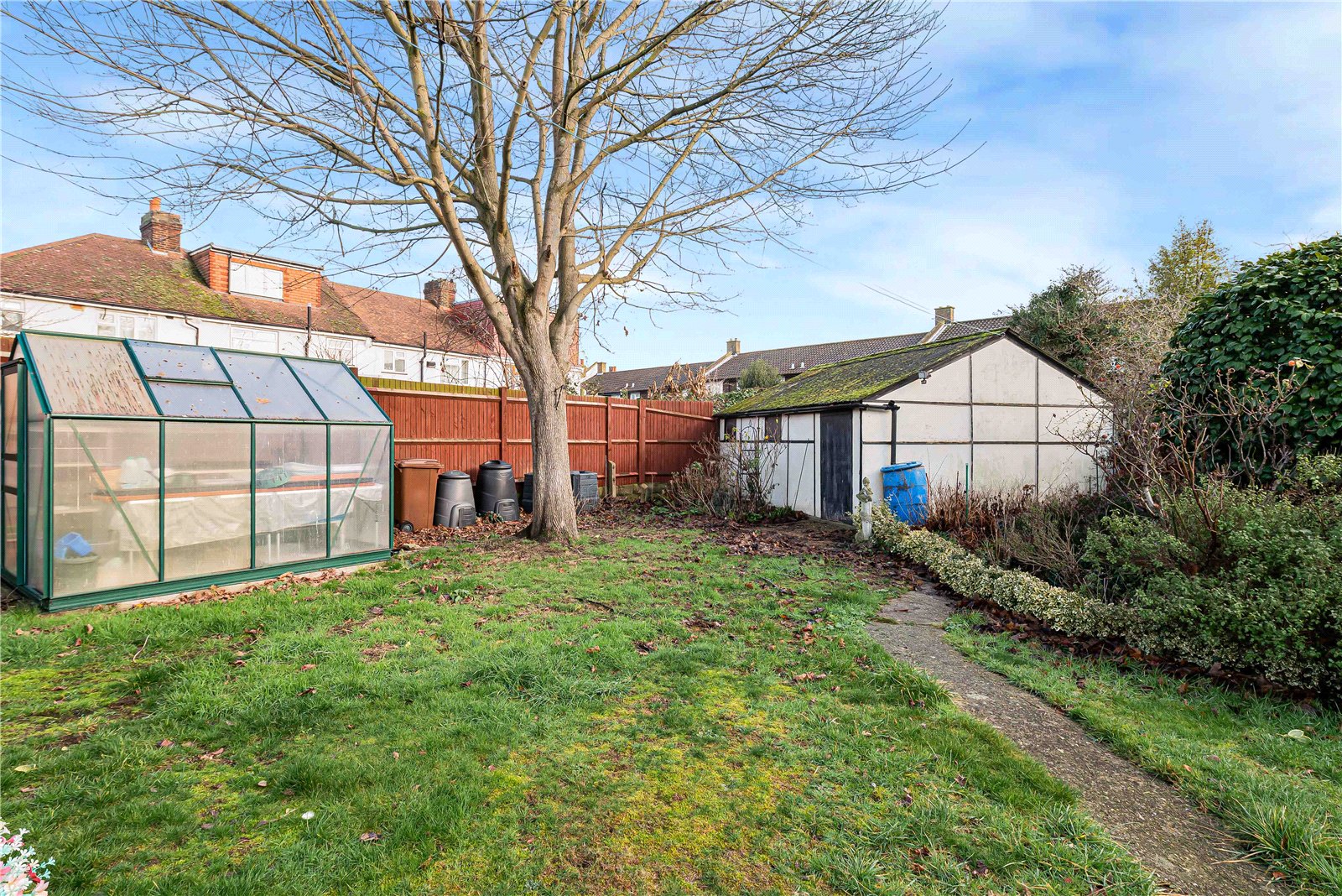 The accommodation offers a true blank-canvas feel, with a highly practical layout that provides the perfect opportunity for a buyer to add their own stamp. The property benefits from a driveway to the front, along with useful side access. The ground floor comprises two reception rooms and a kitchen, with a shower/utility room to the side. The kitchen opens onto one of the largest gardens in Brockley, featuring a large shed and an impressive double garage to the rear measuring approximately 300 sq ft, offering excellent potential to be converted into a home office or studio.