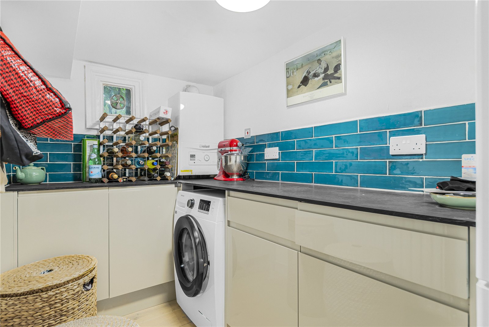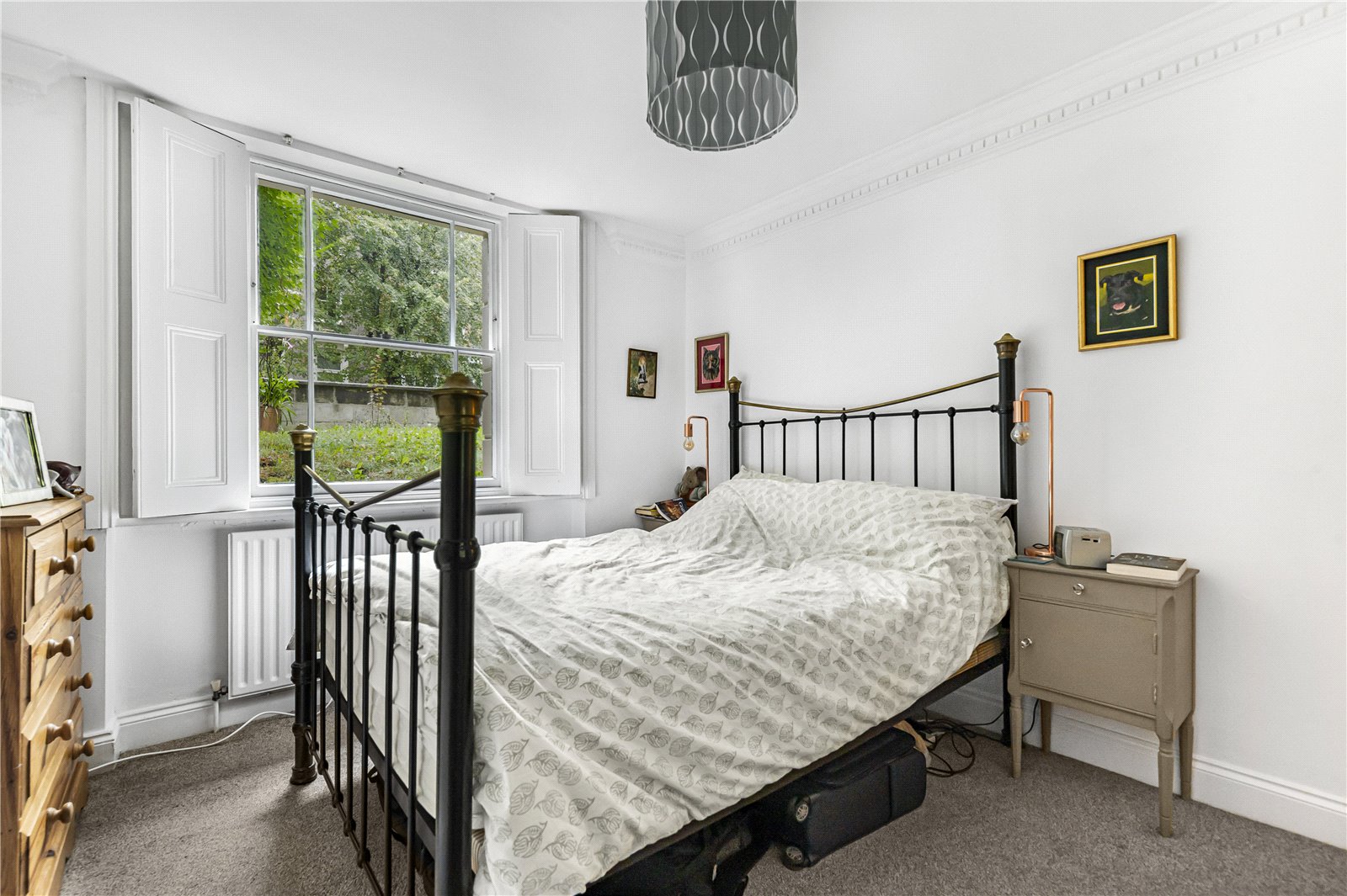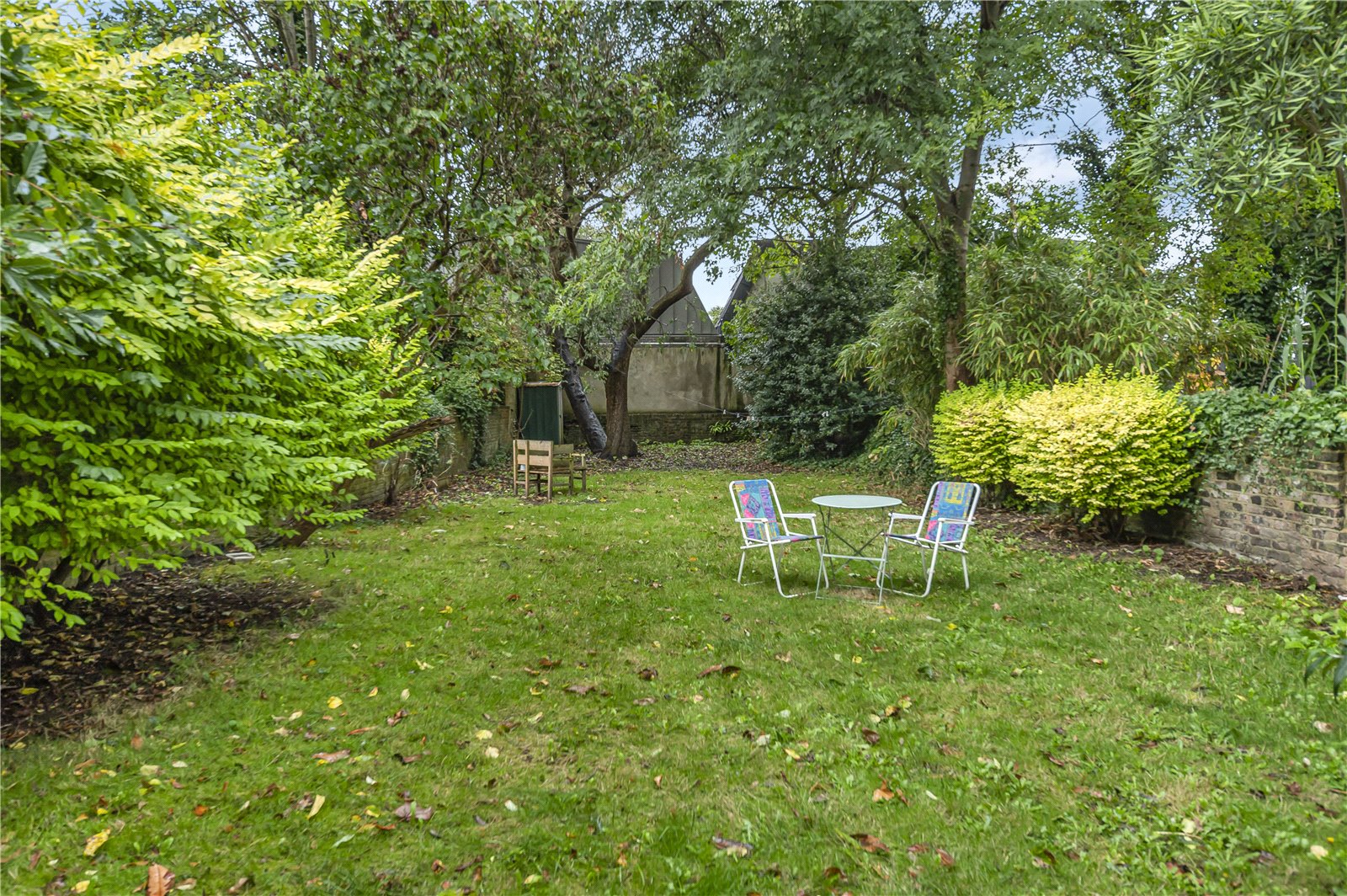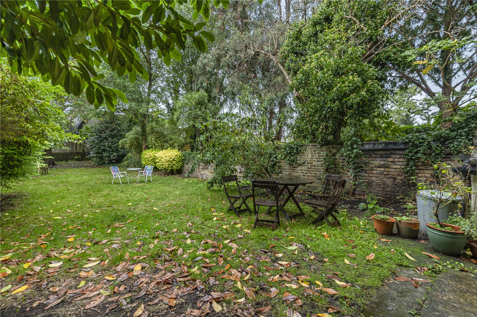 The property is accessed via its own private entrance and retains many of its period features including shutters on both bedrooms and elegant cornicing. The two generous double bedrooms have built-in wardrobes. There is a fully fitted kitchen and separate utility room along with a modern fully-tiled bathroom. The spacious reception room includes a large storage cupboard and opens directly onto a large communal garden with mature trees and hedges. There is additional shared storage for bicycles or other equipment.