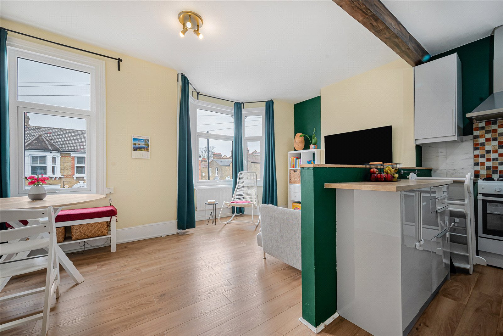 The property features a bright and spacious open plan living room and kitchen, flooded with natural light from a large bay window which creates an airy living space with ample room for both relaxing and dining. The modern fitted kitchen offers plenty of workspace and storage, making it both practical and stylish for everyday living.