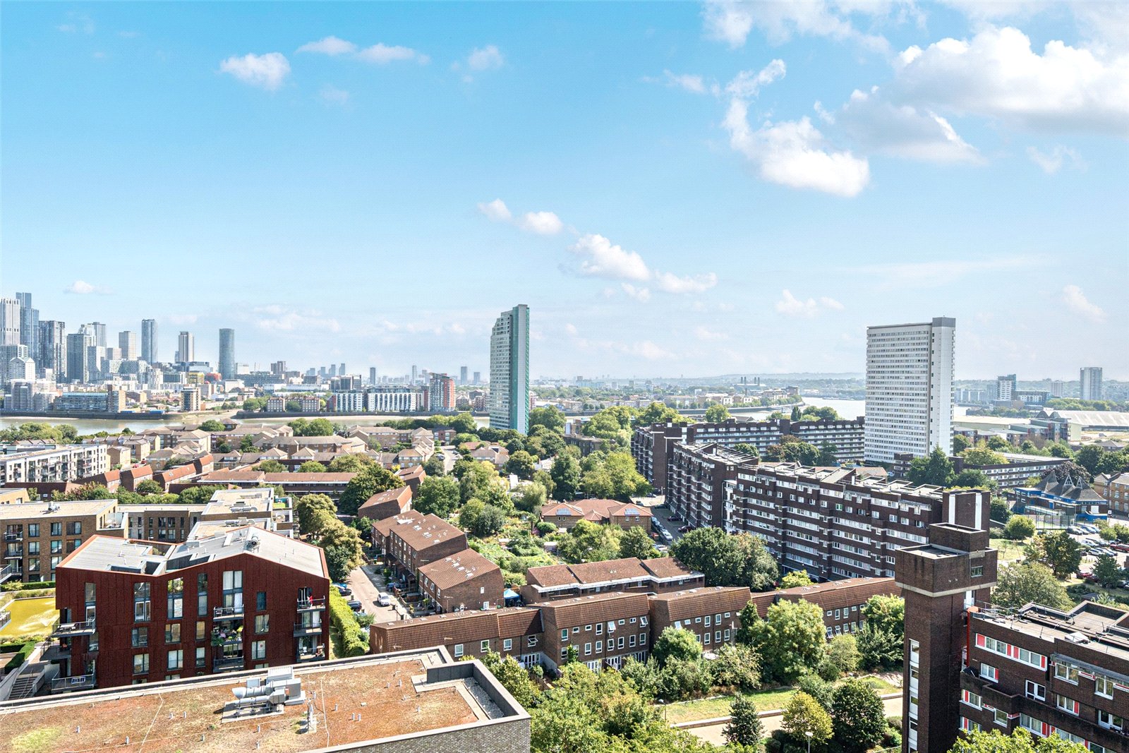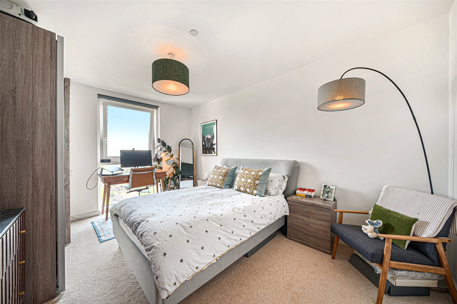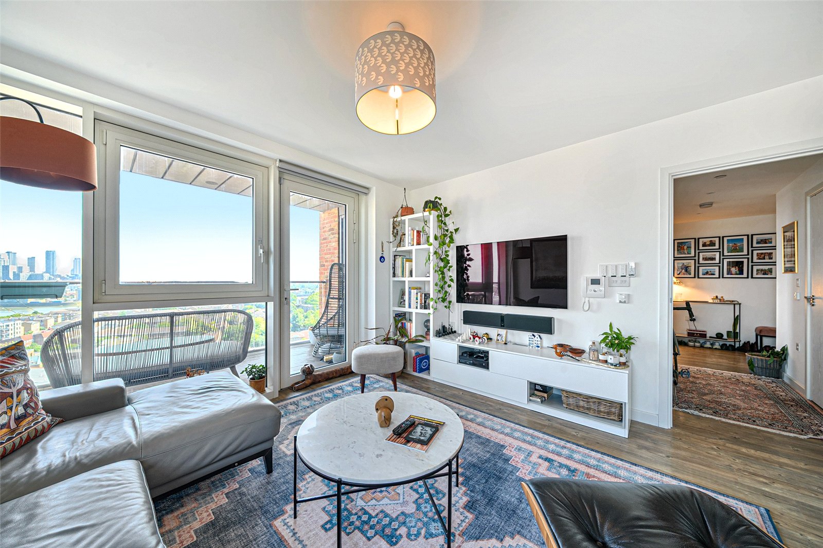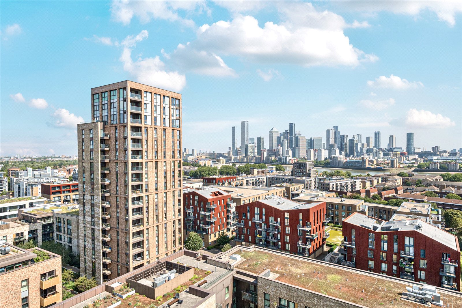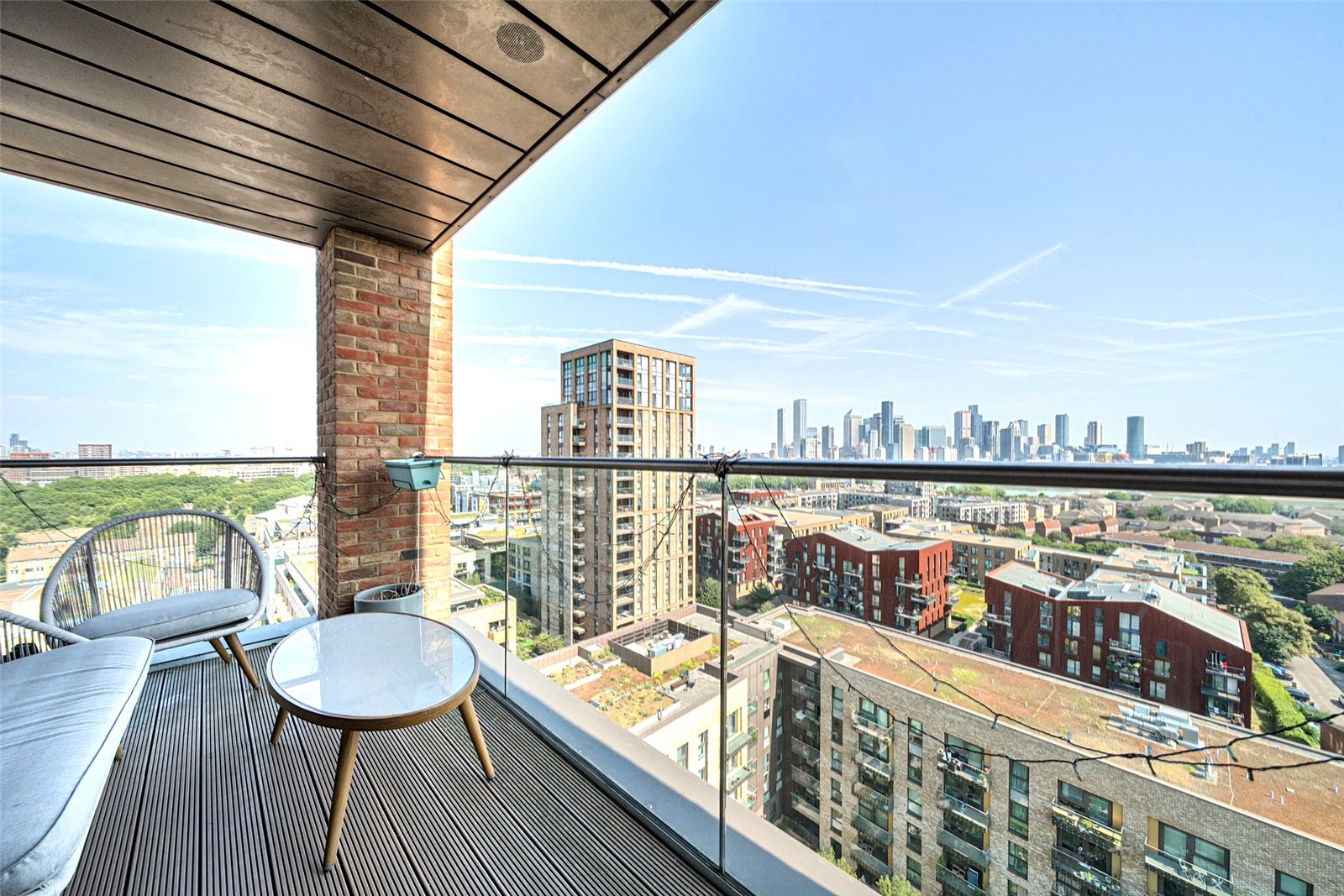 A stylish 845sqft high-floor apartment, with far reaching views of the London skyline and River Thames. It has a bright, balanced and spacious layout, floor-to-ceiling glazing, two bathrooms, large balcony, open-plan kitchen, ample hallway storage, a secure parking space and use of the onsite 24-hour concierge, residents’ gym and gated communal garden.