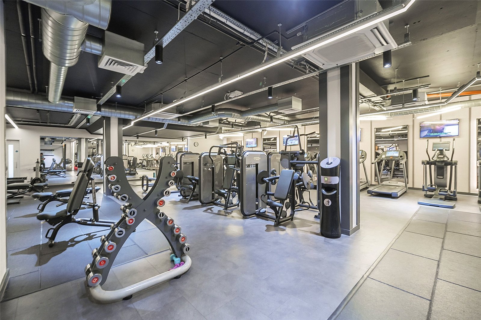 This bright and airy home was constructed in 2017 and is offered in excellent condition. It features a desirable bathroom layout with a separate bath and shower, a spacious bedroom and an attractive kitchen with matt-finished units and integrated appliances. It is situated close to the entrance of both the concierge and gym. There are also three useful cupboards in the hall, one housing the washing machine and the others for general storage.