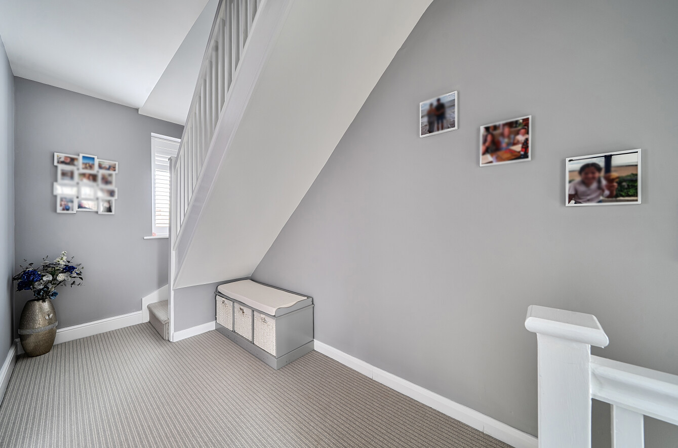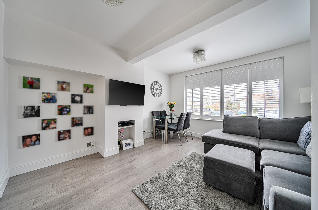 The frontage here provides off street parking on the driveway with access to the house via an enclosed porch. Once inside there is a good sized reception room of c. 181 sq ft with grey wood effect flooring. The large window with Plantation shutters allows for plenty of natural daylight - (please note the shutters and blinds at the property are to remain) and there is ample space for comfortable seating as well as a dining table and chairs.