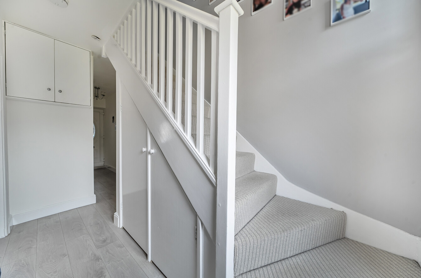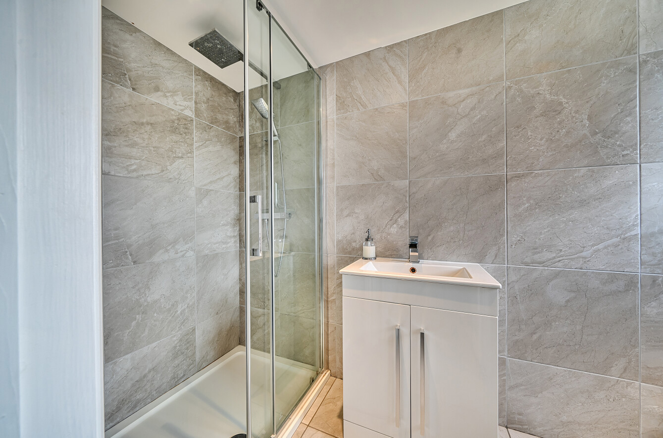 On the second floor is the third bedroom which is a spacious 168 sq ft, from here Velux windows provide a great view of the London skyline. The modern en-suite shower room is fully tiled and has a large walk in shower, wash hand basin and WC. There is access to the eaves for useful extra storage space.