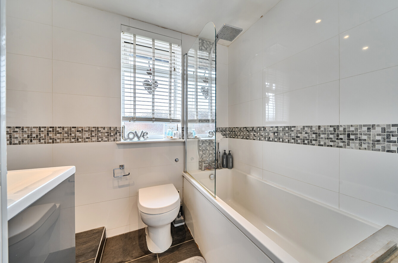 On the first floor are two nicely decorated double bedrooms. These rooms have use of the family bathroom which is fitted with a white suite, bath with shower, vanity wash hand basin with cupboard storage beneath and WC. There is a window for ventilation.