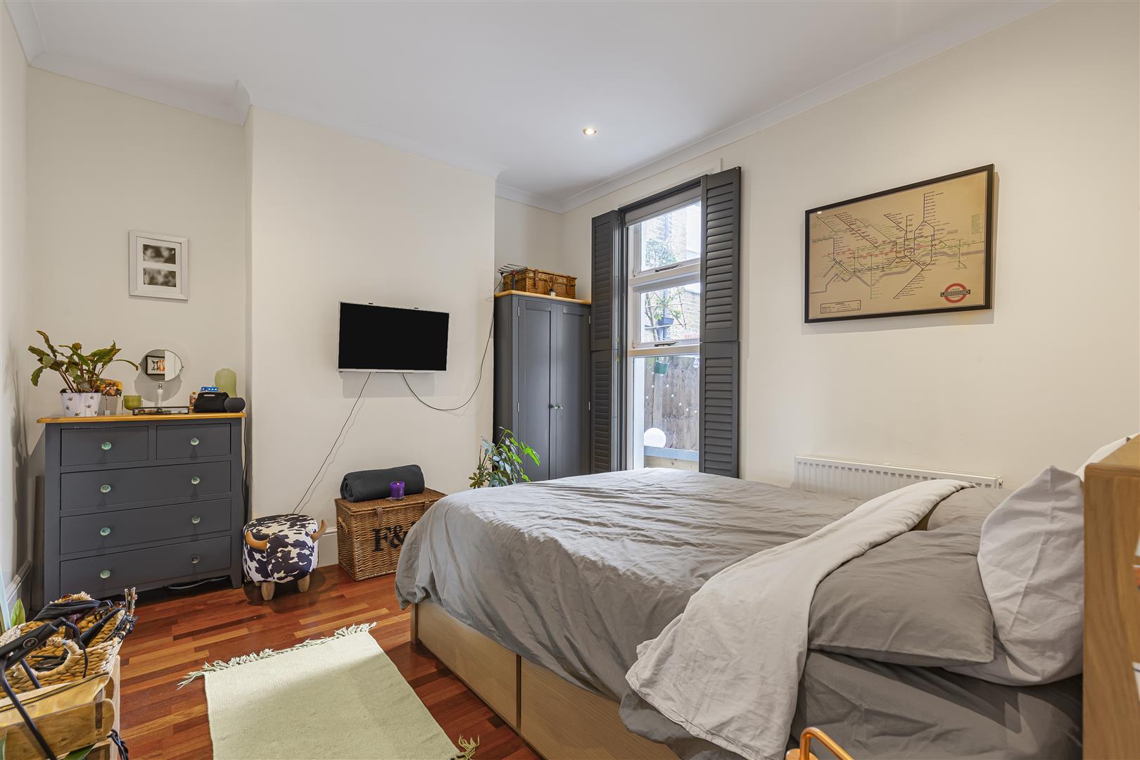 The front reception room is bright and inviting, featuring a striking period fireplace, high ceilings, and traditional shutters. It provides a generous space for relaxing or entertaining guests, creating a welcoming first impression of the property. The principal bedroom is well-proportioned, offering ample space for storage while maintaining a tranquil, comfortable atmosphere.