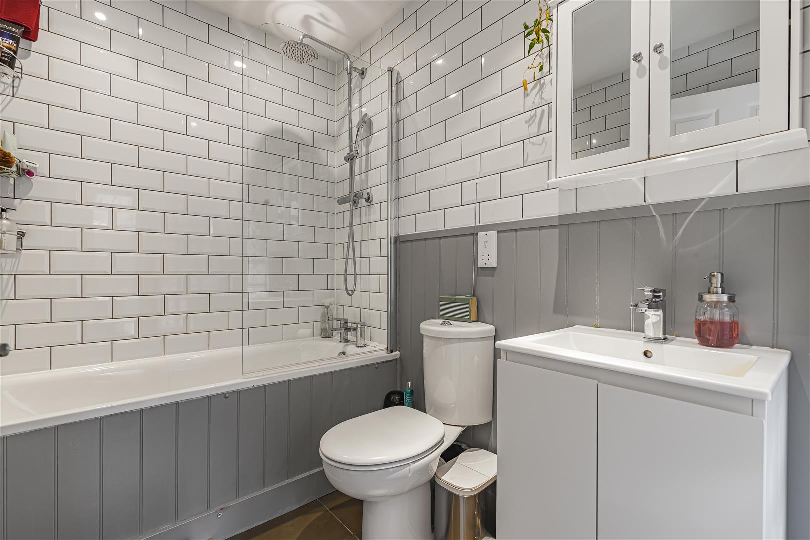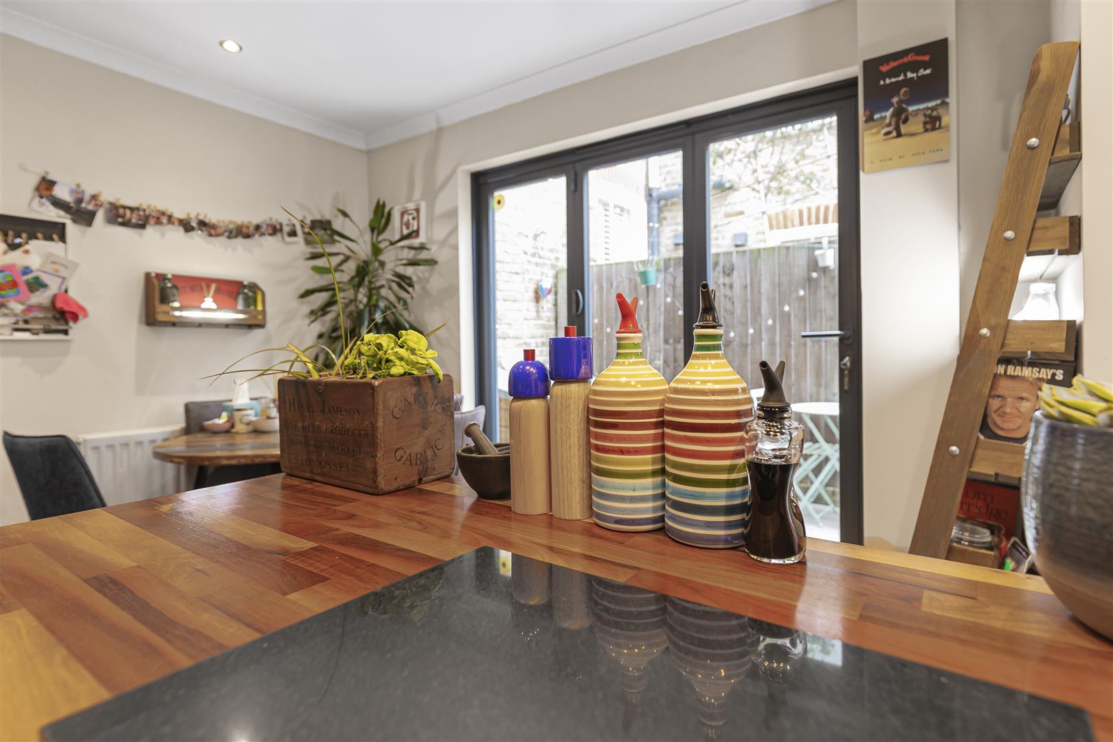 At the heart of the apartment is the open-plan kitchen and dining area, which has been thoughtfully designed to cater to modern living. The newly fitted kitchen features integrated appliances and a Philips Hue smart lighting system, making it as functional as it is stylish. Bifold doors lead directly onto the landscaped, low-maintenance rear garden, creating a seamless indoor-outdoor flow that is perfect for entertaining during the warmer months or simply enjoying some quiet outdoor space.