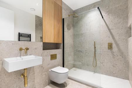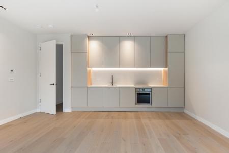 The apartment is finished with premium materials, including bespoke kitchens featuring integrated Smeg appliances, striking cabinetry, stone worktops and Lusso gunmetal grey fittings. Whitewashed oak floors and underfloor heating extend throughout the home, complemented by contemporary bathrooms and spacious bedrooms with floor-to-ceiling wardrobes and LED-lit headboards.
