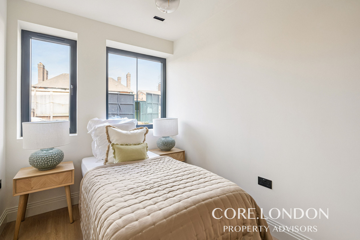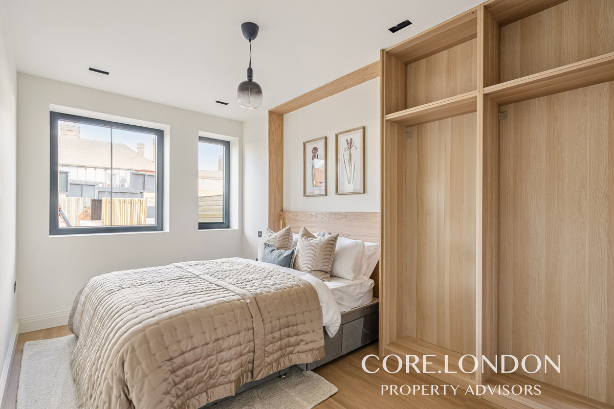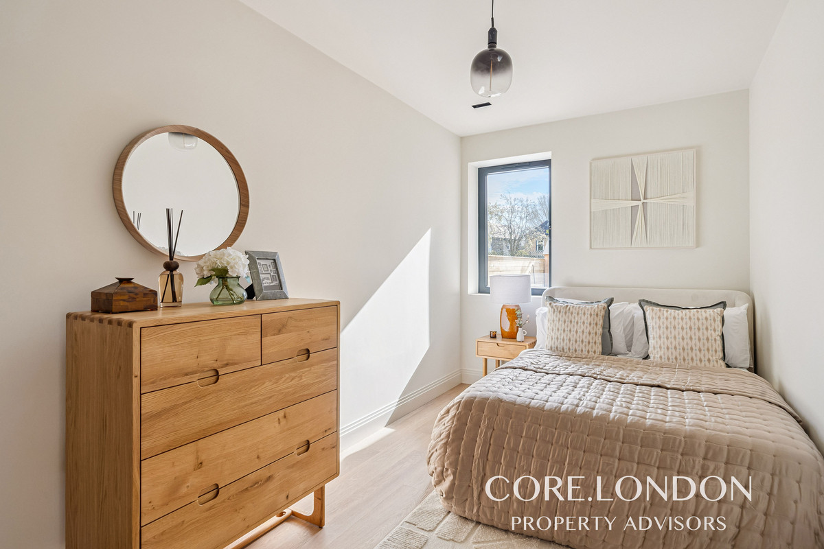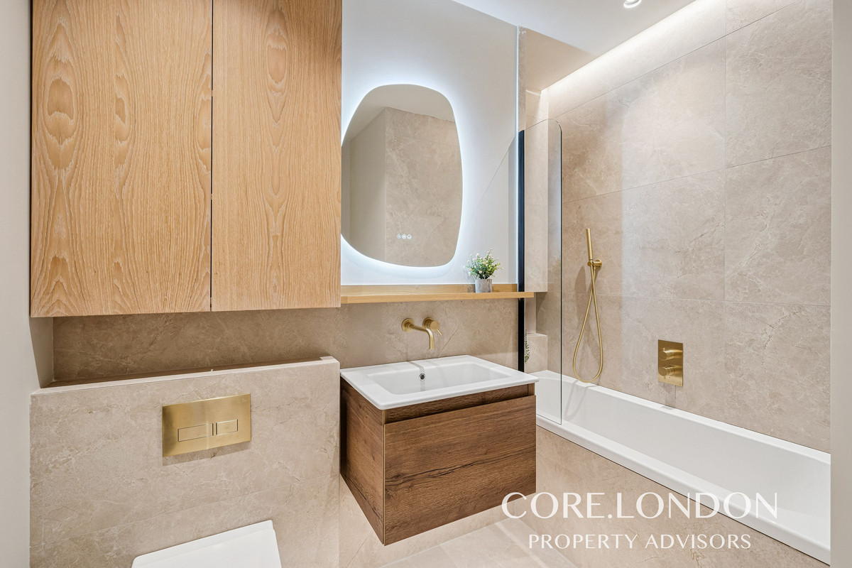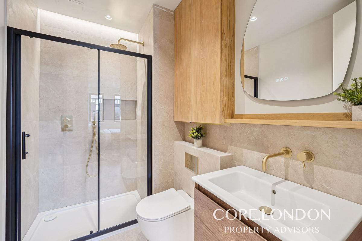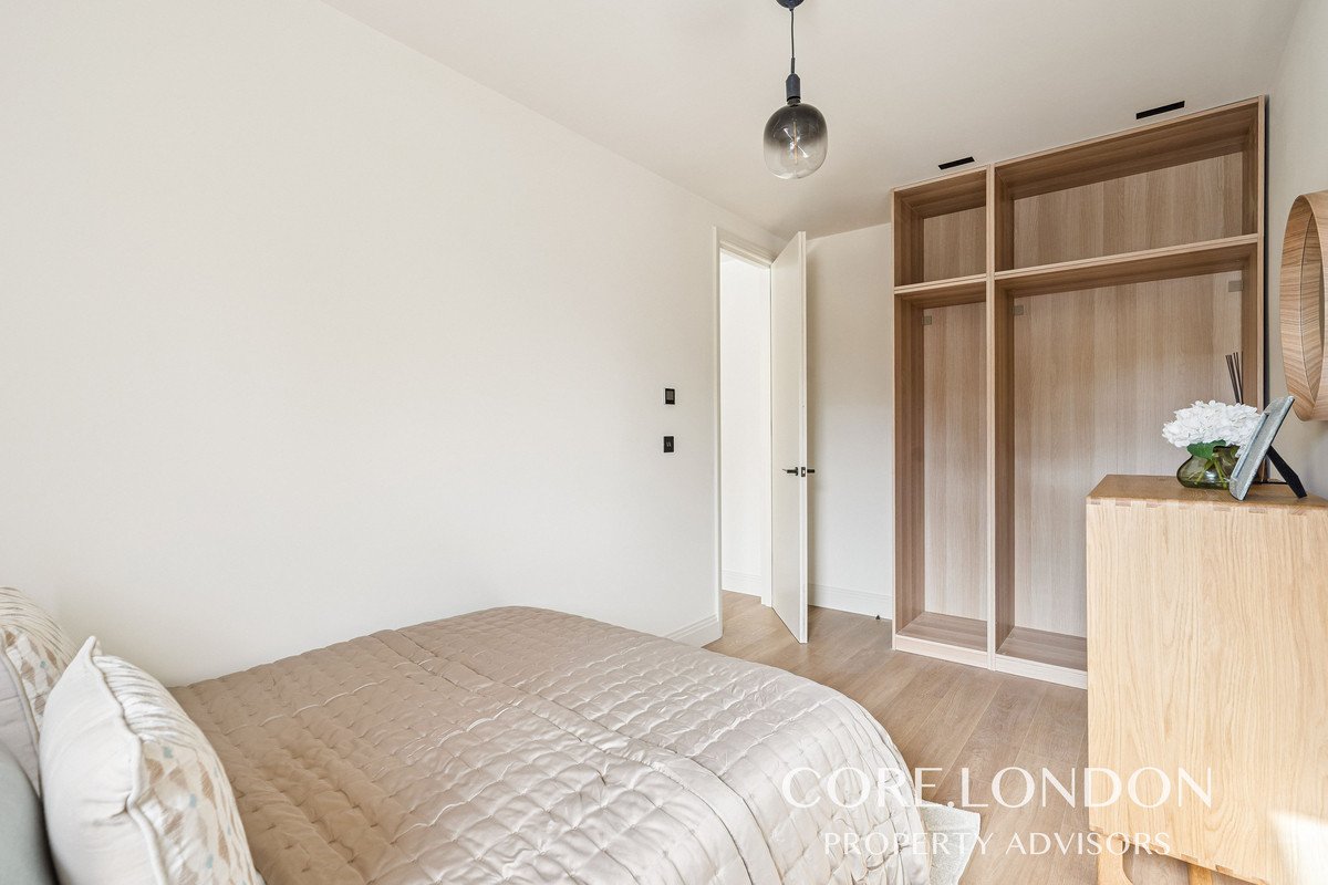 The bedrooms include fitted floor-to-ceiling wardrobes, while the bathrooms are finished with luxury contemporary Italian sanitaryware, Crosswater fittings, a rainfall shower, bespoke vanity unit and heated towel rail, all complemented by large-format porcelain tiling.