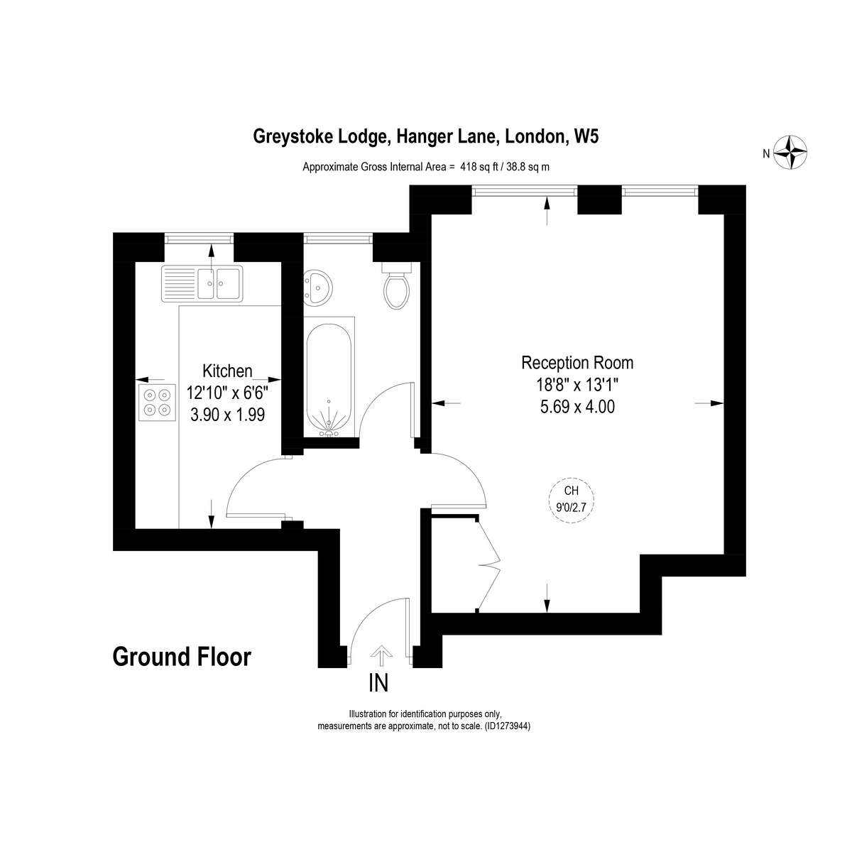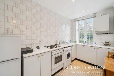 This bright and versatile studio apartment extends to approximately 418 sq ft and is arranged to maximise both space and natural light. The generous reception room measures 18’8 x 13’1, providing ample room to clearly define living, dining and sleeping areas, while enjoying tall windows overlooking the communal grounds.