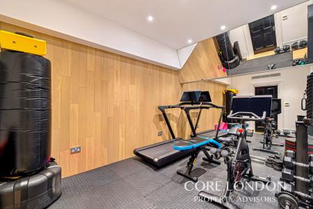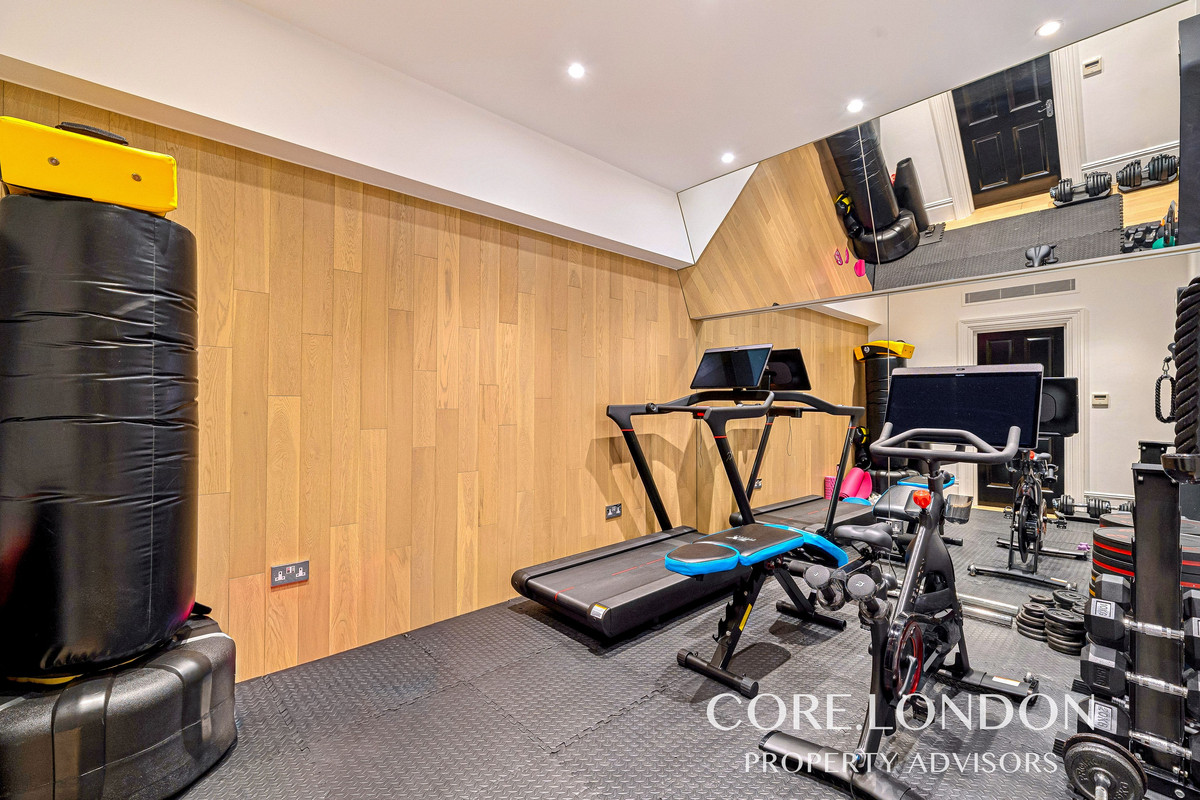 The lower ground floor provides a substantial additional living space, including a cinema room, fully equipped gym and sauna, offering a dedicated wellness and entertainment area. A separate utility room adds further practicality.