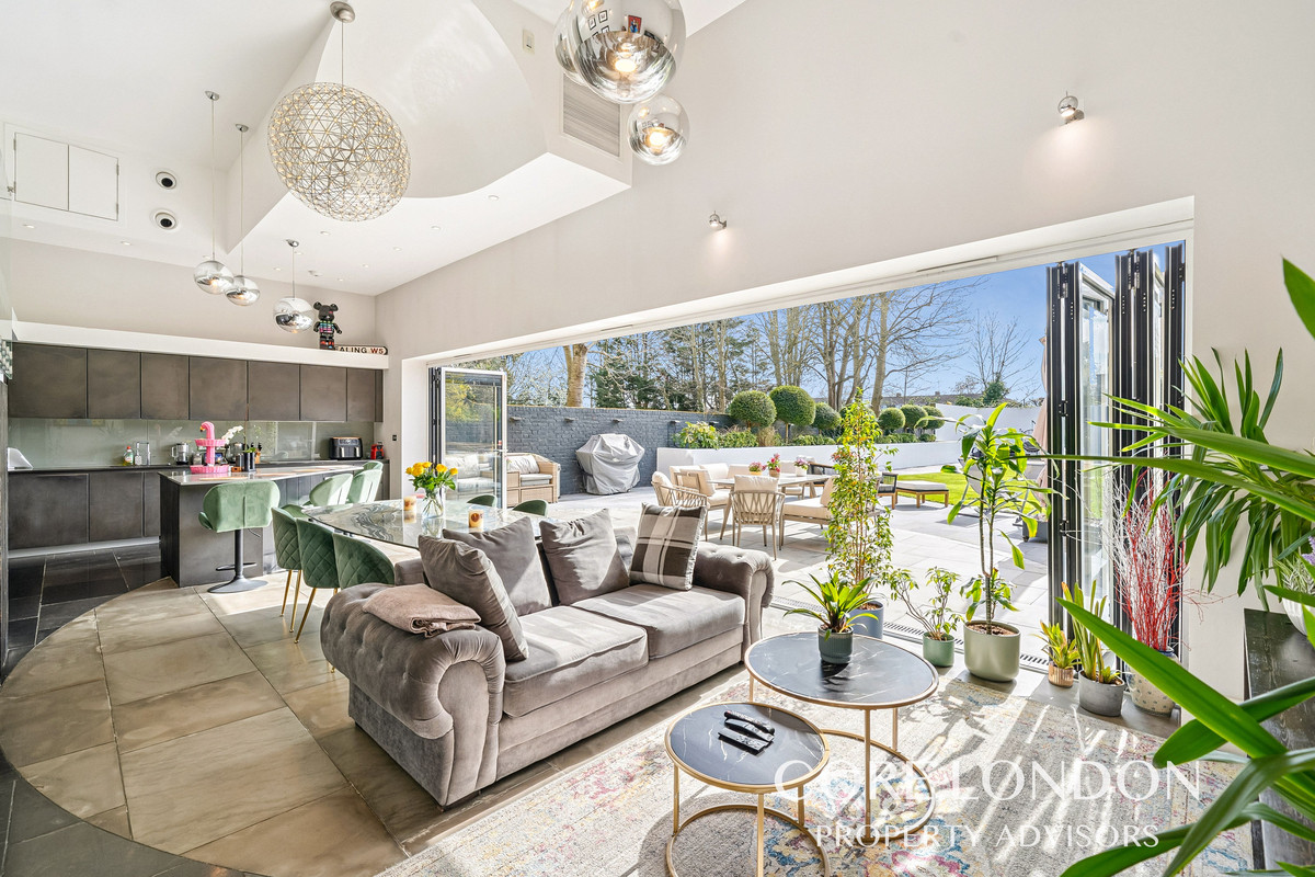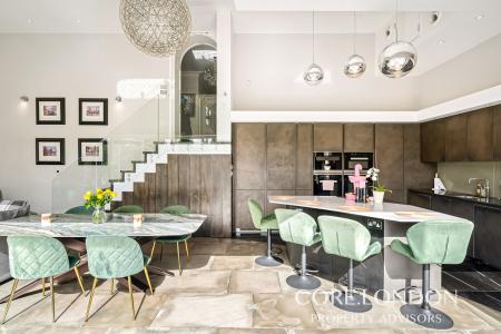 The ground floor is centred around an impressive open-plan kitchen, designed with both everyday living and entertaining in mind. A large central island, high-specification appliances and excellent storage make it highly functional, while full-width bi-fold doors open onto a south-facing garden, creating a seamless connection between inside and out.