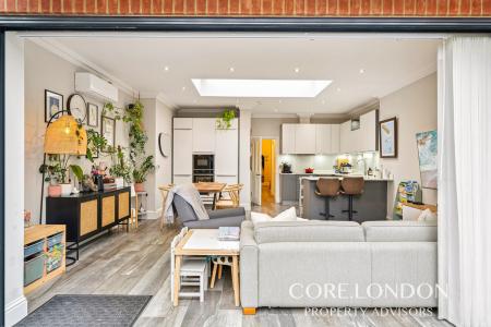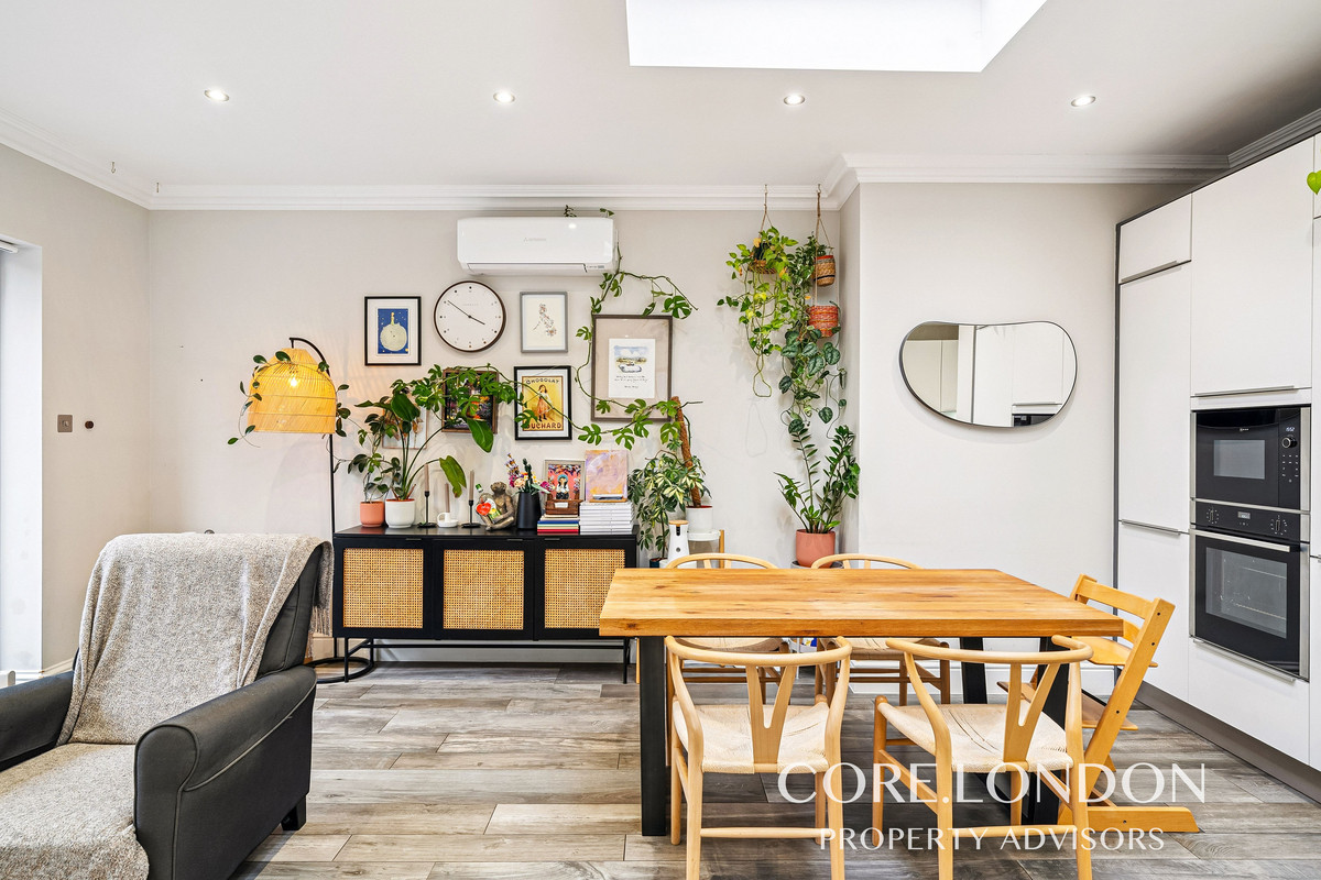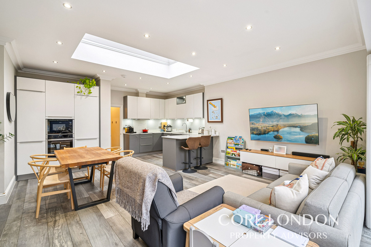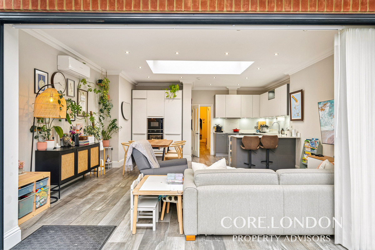 The property features a stunning open-plan kitchen, dining and reception area, designed for both everyday living and entertaining. Flooded with natural light from a large skylight and full-width bi-fold doors, this space seamlessly connects to a private landscaped garden, creating an ideal indoor-outdoor lifestyle. The property further benefits from air conditioning, enhancing comfort throughout the year.