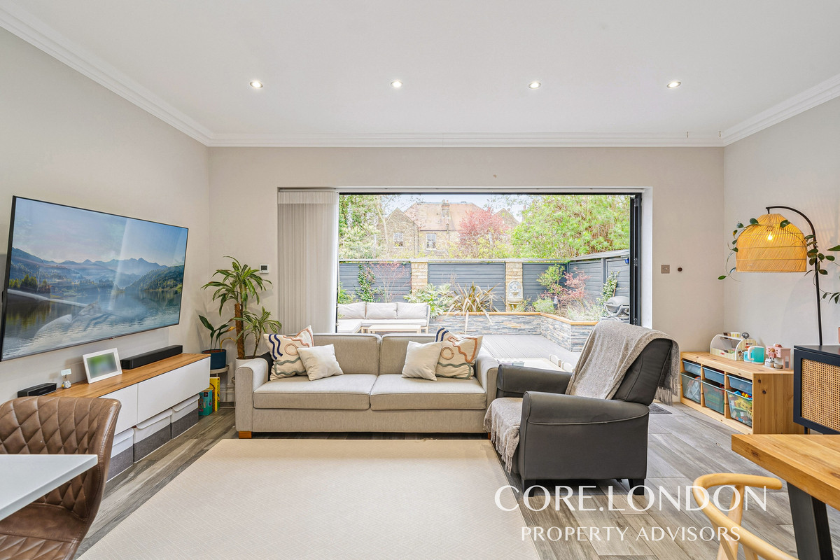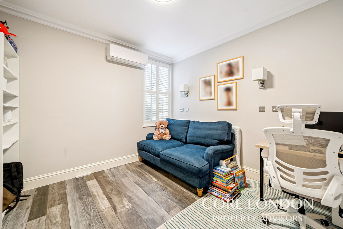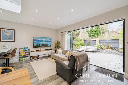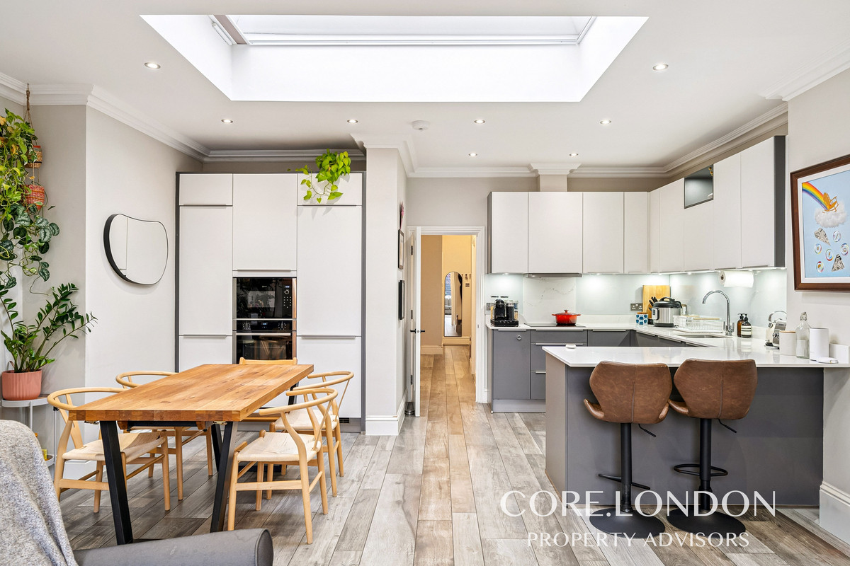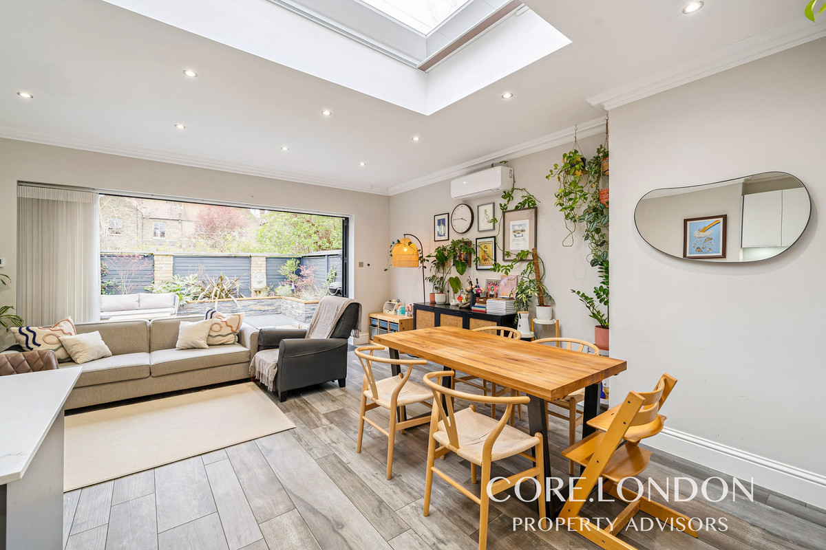 The property features a stunning open-plan kitchen, dining and reception area, designed for both everyday living and entertaining. Flooded with natural light from a large skylight and full-width bi-fold doors, this space seamlessly connects to a private landscaped garden, creating an ideal indoor-outdoor lifestyle. The property further benefits from air conditioning, enhancing comfort throughout the year.