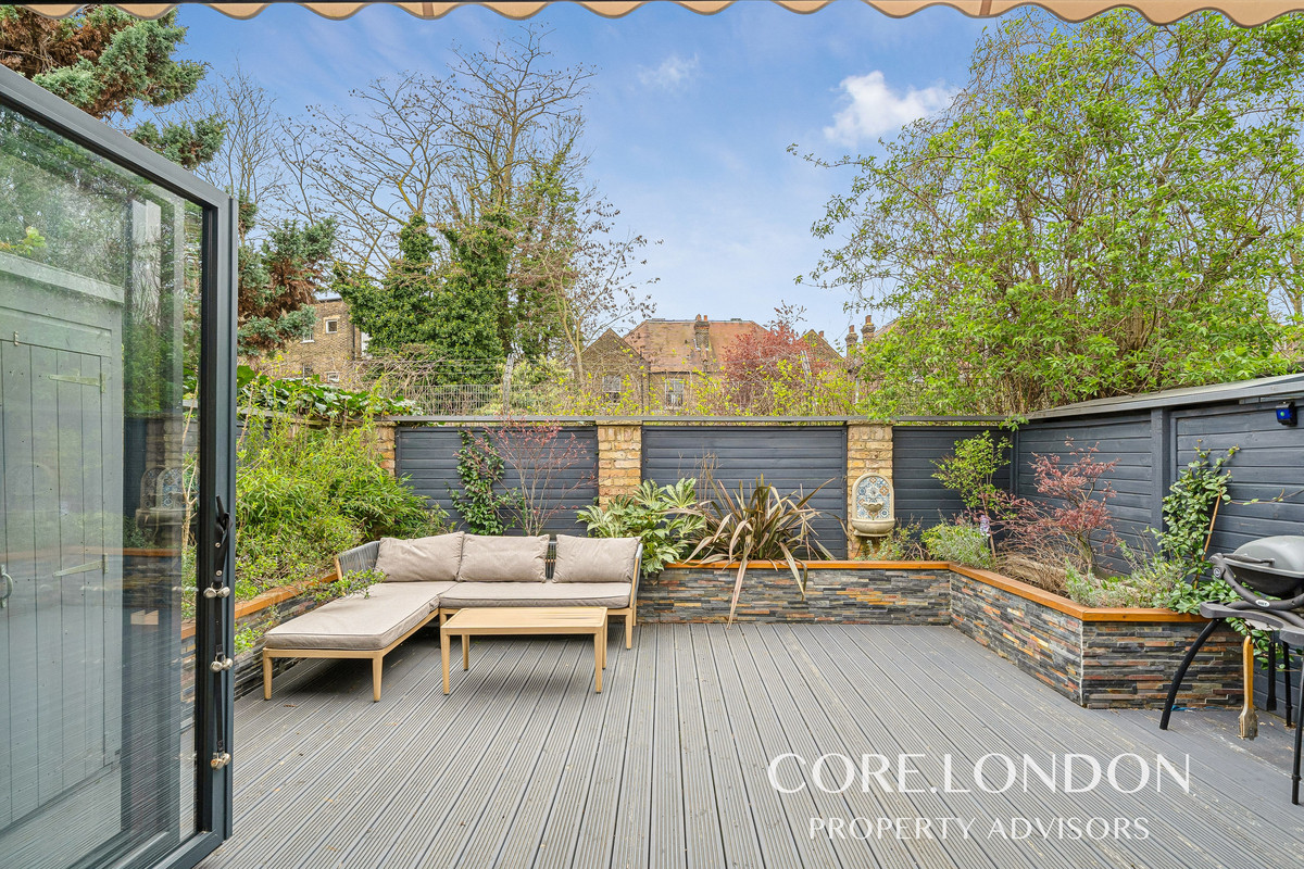 The garden has been thoughtfully designed with decking and raised planters, offering a low-maintenance yet stylish outdoor retreat.