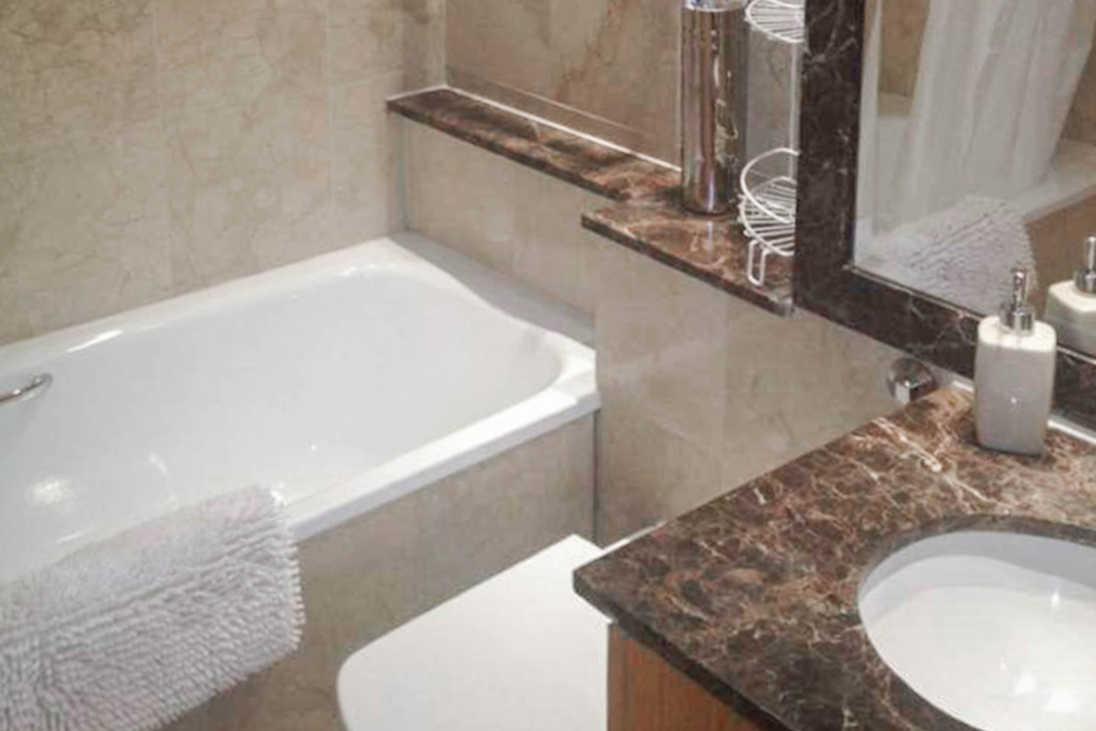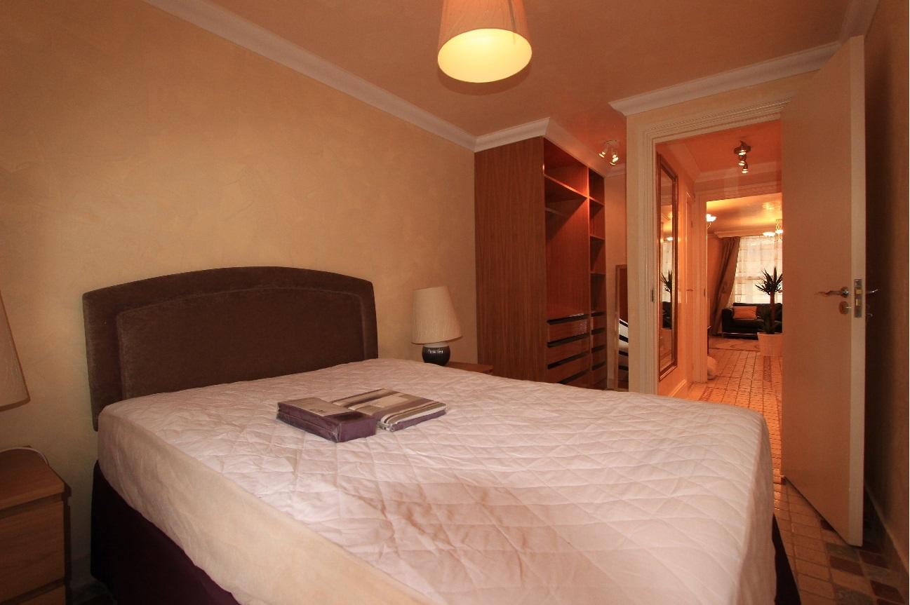 The property features marble flooring throughout and comprises a bright reception area, a fitted kitchen, two double sized bedrooms one with built in wardrobe storages/dressing area, and a contemporary bathroom.