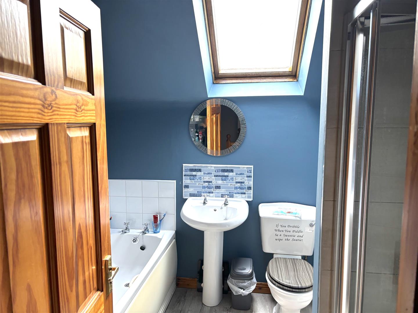 Bathroom: - With a fitted white bath, pedestal wash hand basin and Low Flush W.C. Fully tiled shower cubicle with electric shower.
