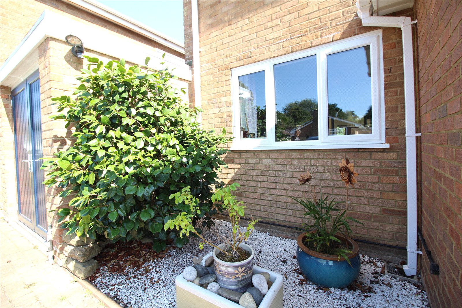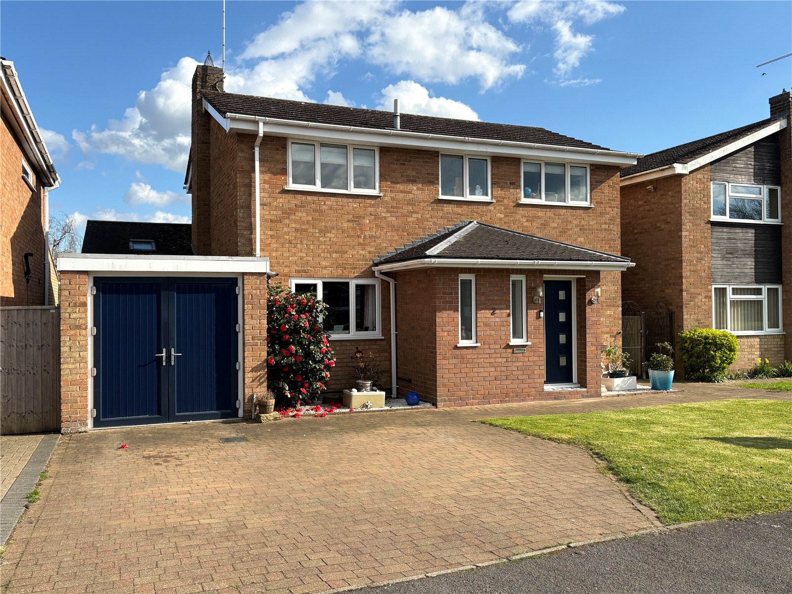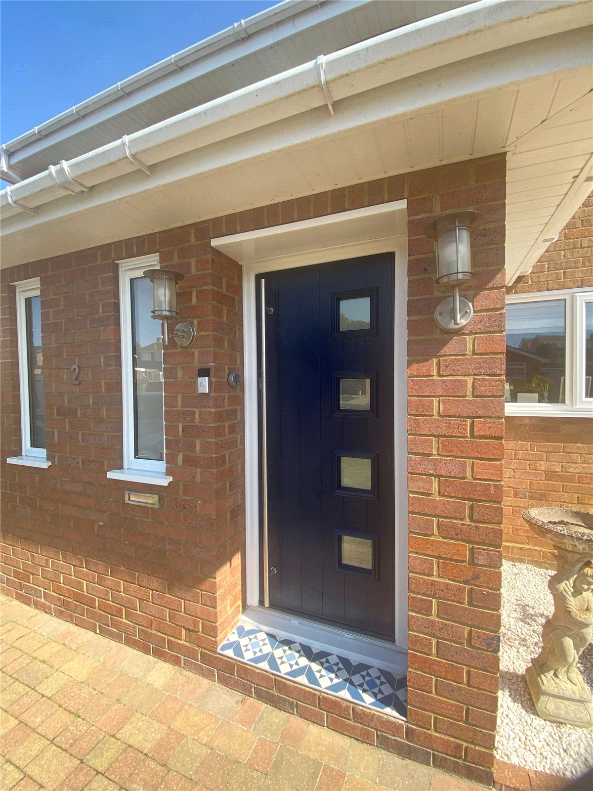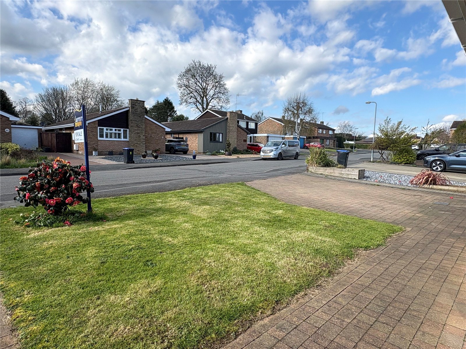 Front The property is accessed via a block paved driveway for at least two cars leading to garage and recently replaced Composite front door with a partly lawned garden to one side with mature shrubs and a further block paved path leading to gated access to the rear, security lights to both the outside of the garage and the front door.
