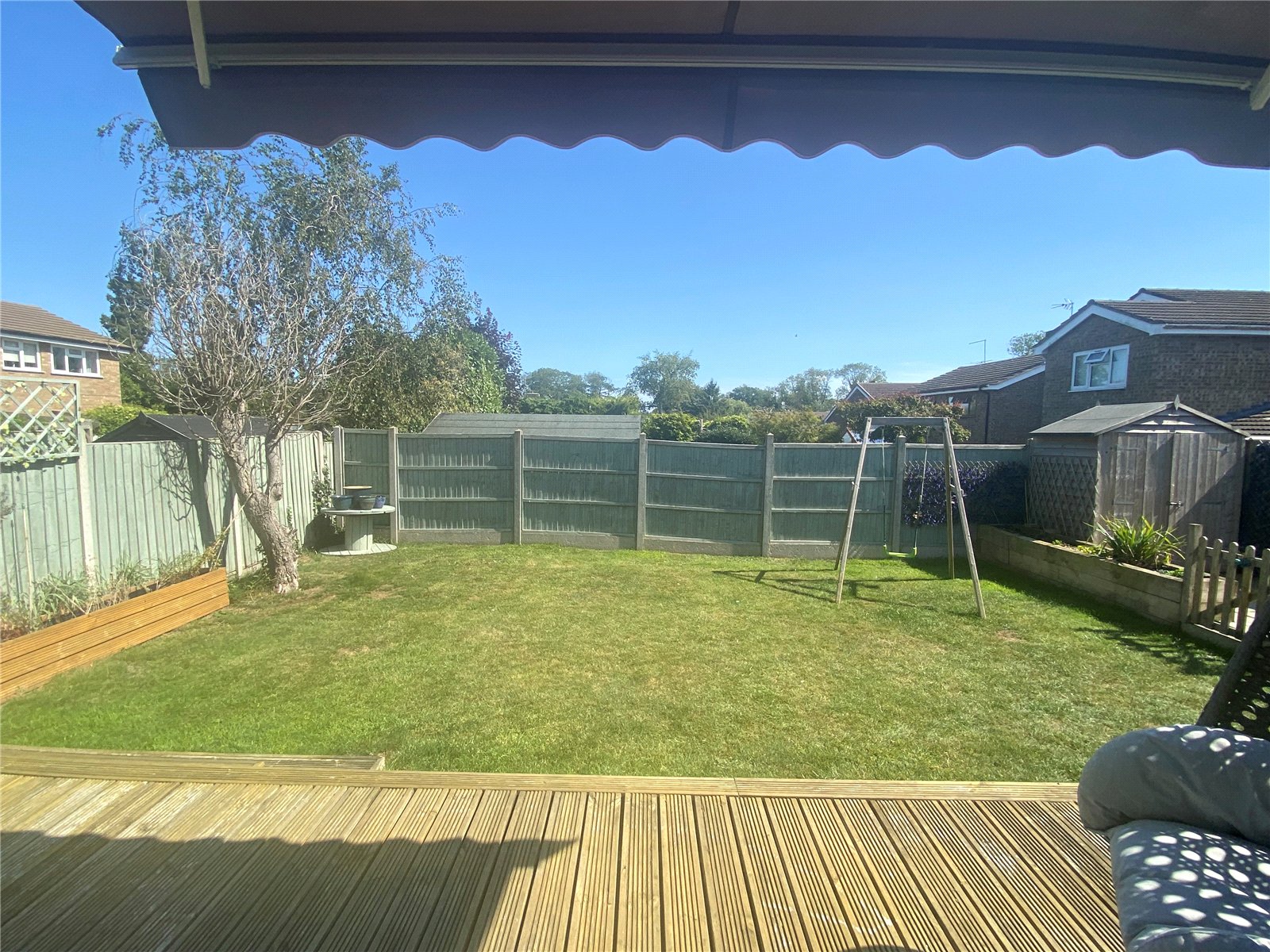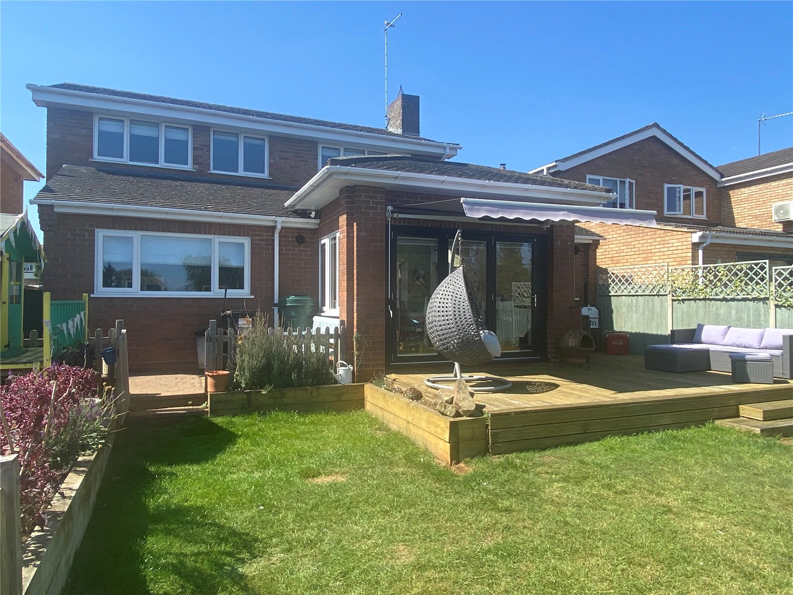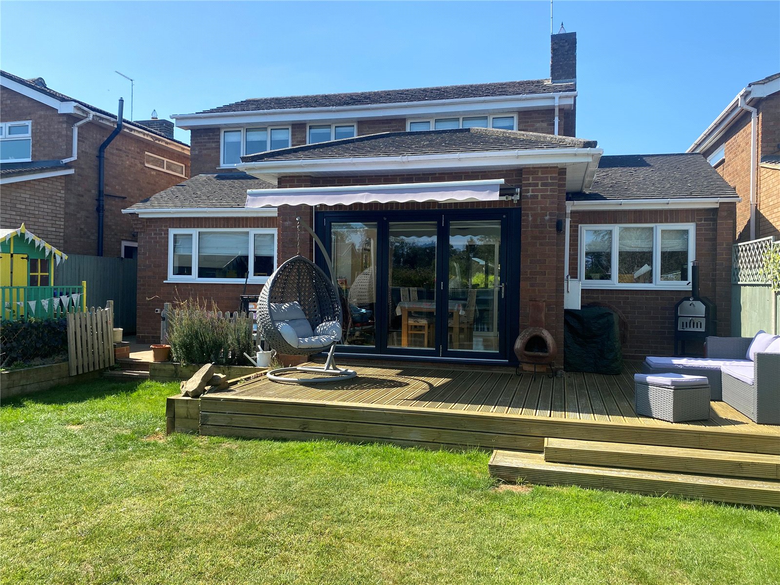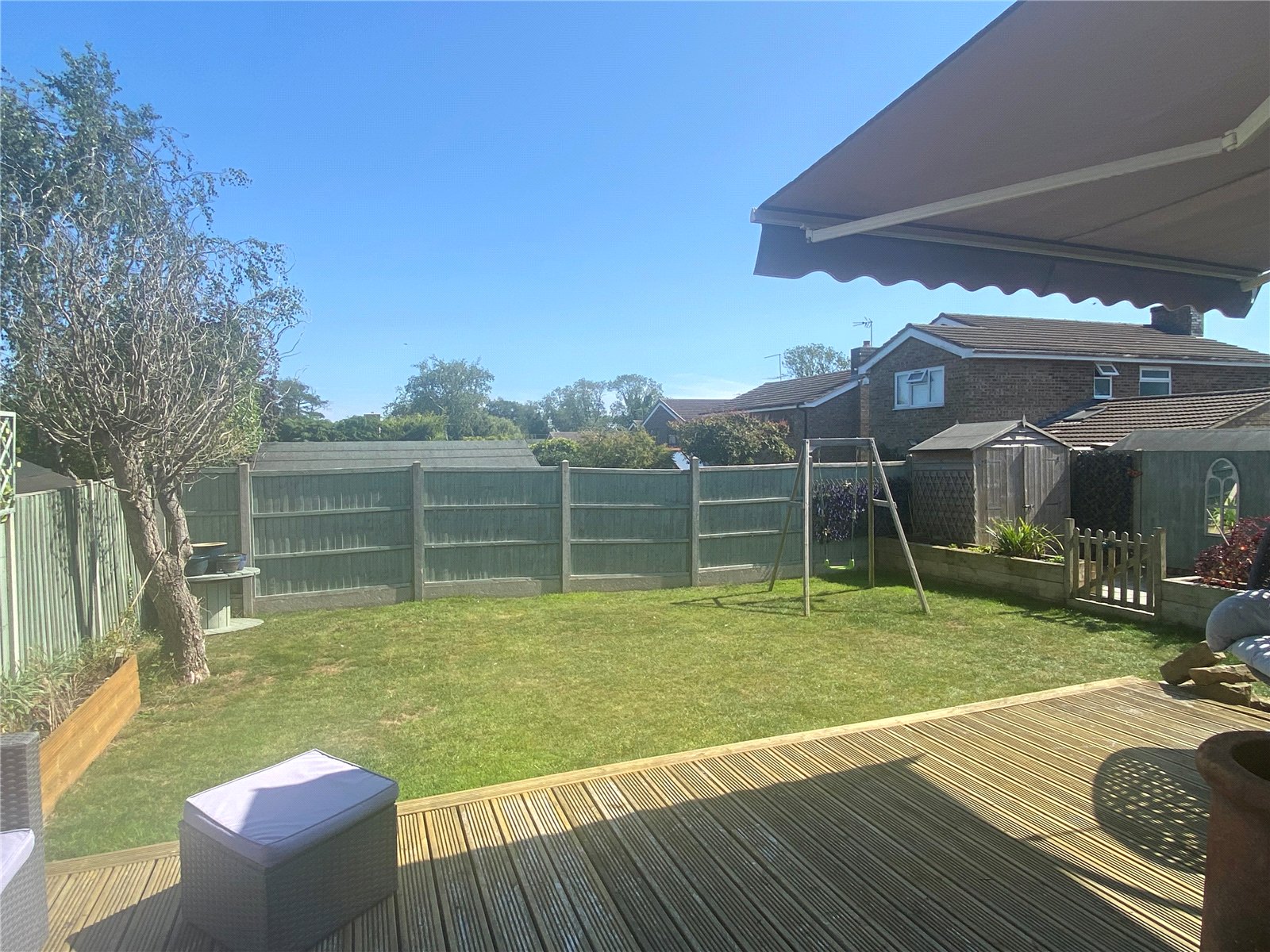 Rear Accessed by the gate to front, door from the Utility Room and from Bi Fold doors from the Dining Room/Sunroom which leads to a pleasant elevated recently decked patio area with steps down to the balance of the garden which is mainly laid to lawn and offers both a good level of privacy together with a sunny aspect. Picket fence and gate leads to a further block paved area which in turn leads round to the gated access to the front of the property, Enclosed by timber panel fencing to all sides, external power point and outside tap fitted.