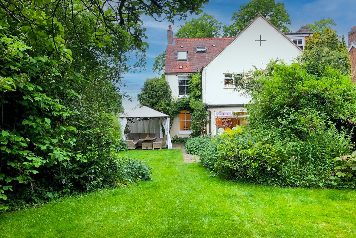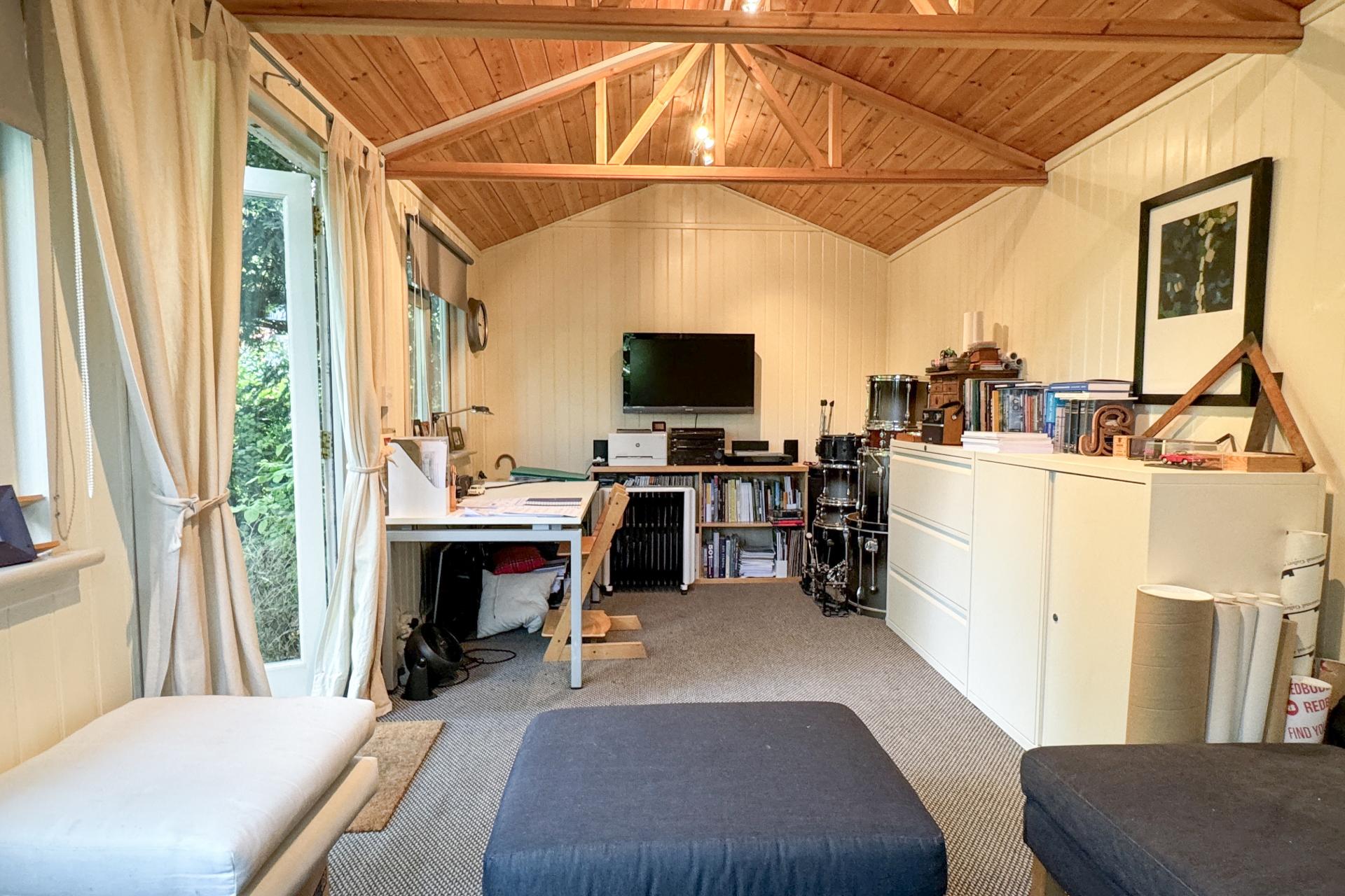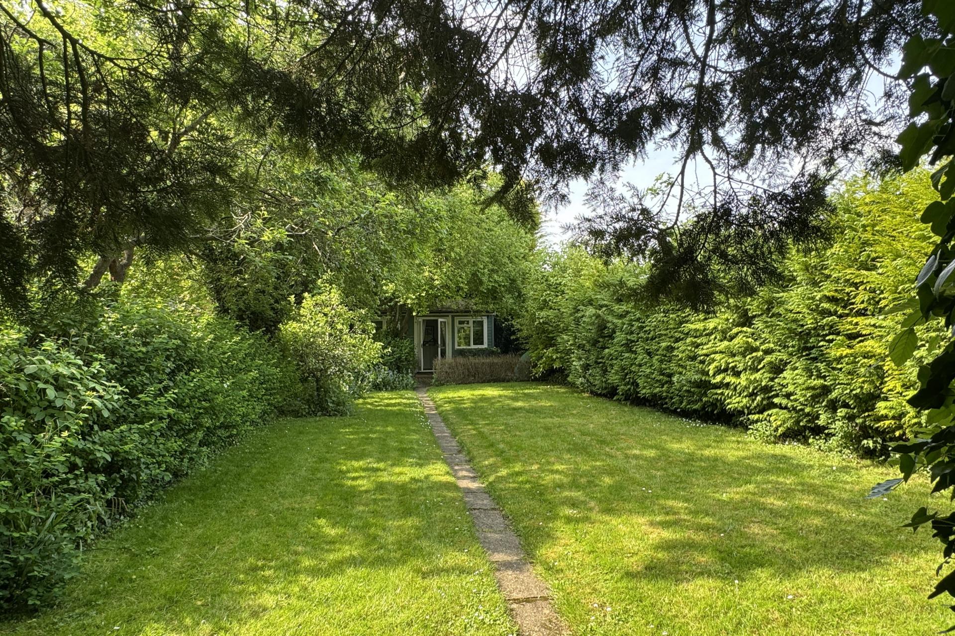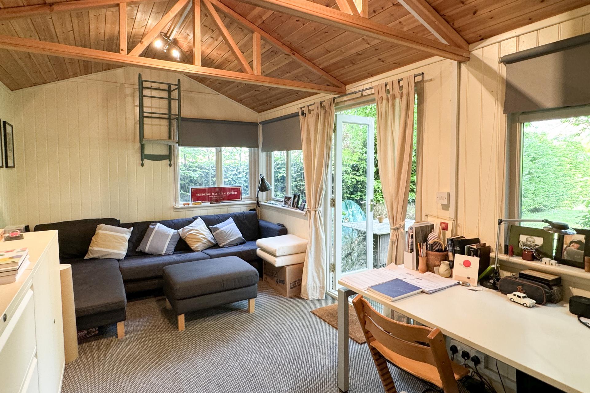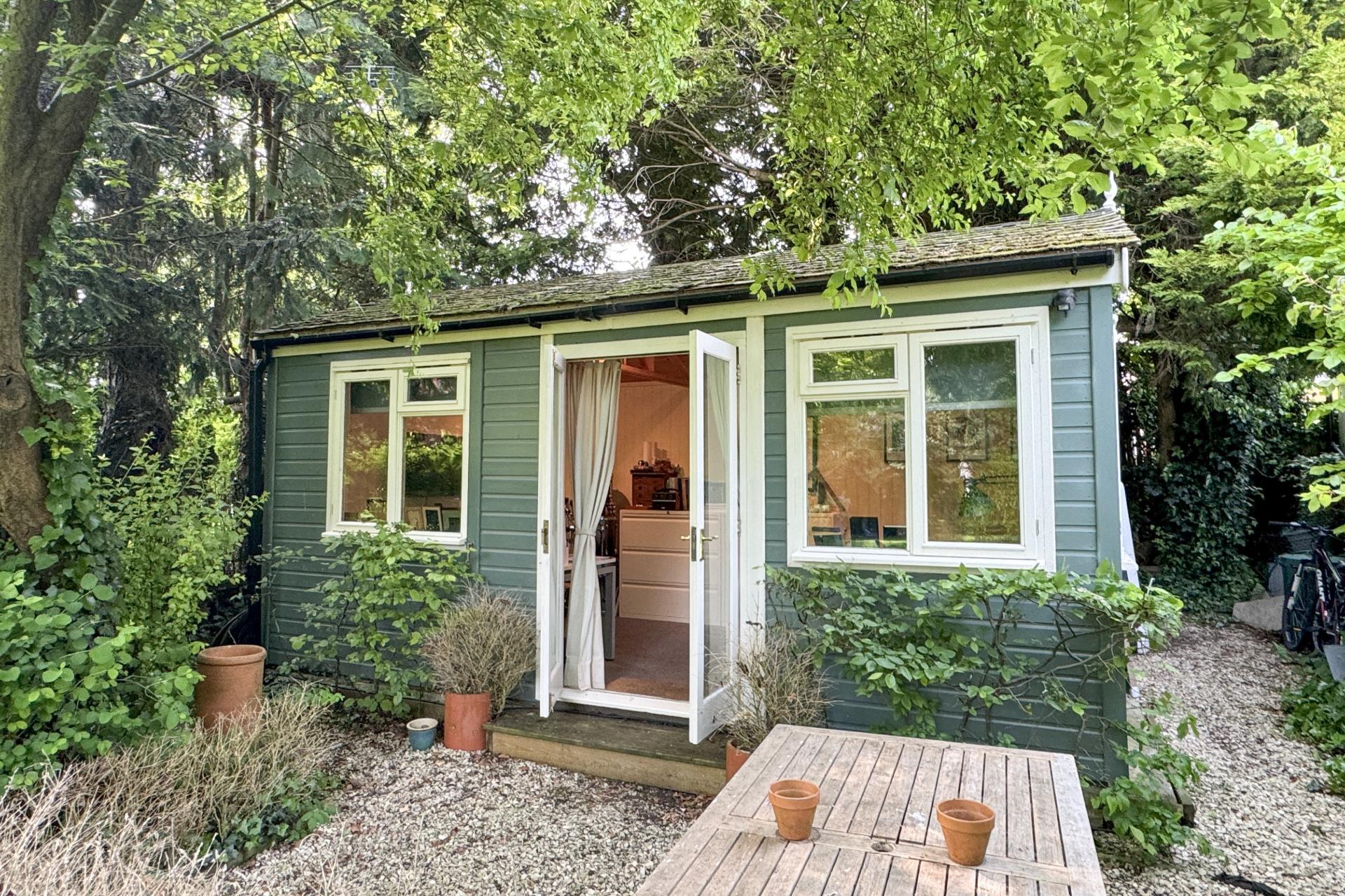 A second staircase leads to bedroom four, offering views over the expansive garden. Outside, the captivating garden boasts a sun terrace surrounded by large shrubs and trees, perfect for outdoor relaxation. The lush lawns and an elongated garden further contribute to the charm. At the bottom of the garden, you will find an adaptable home office or summer house retreat, complete with electricity, offers supplementary serene areas for both work and leisure.