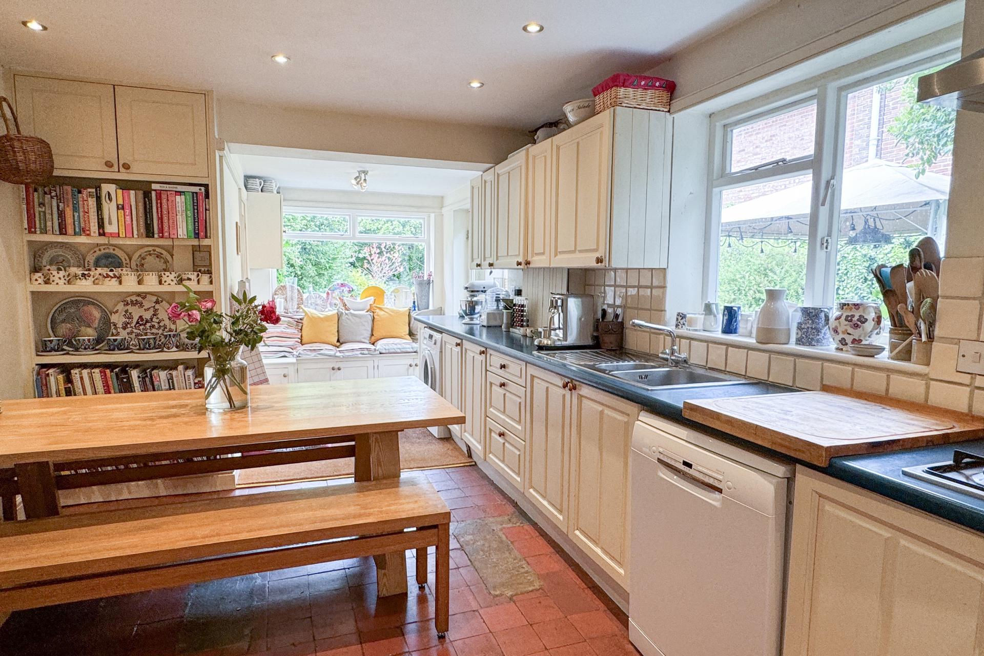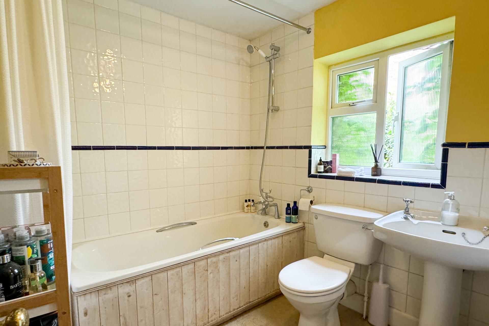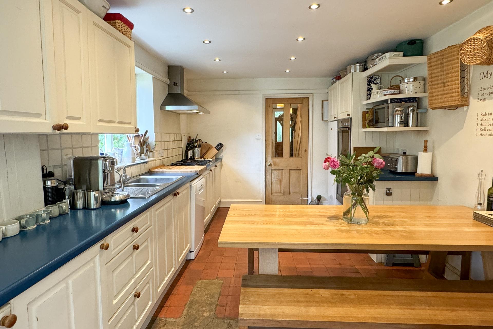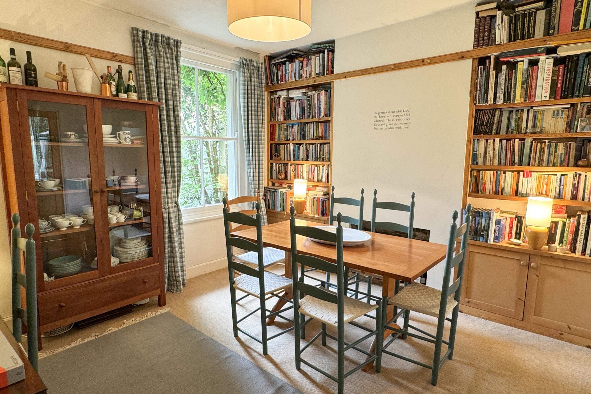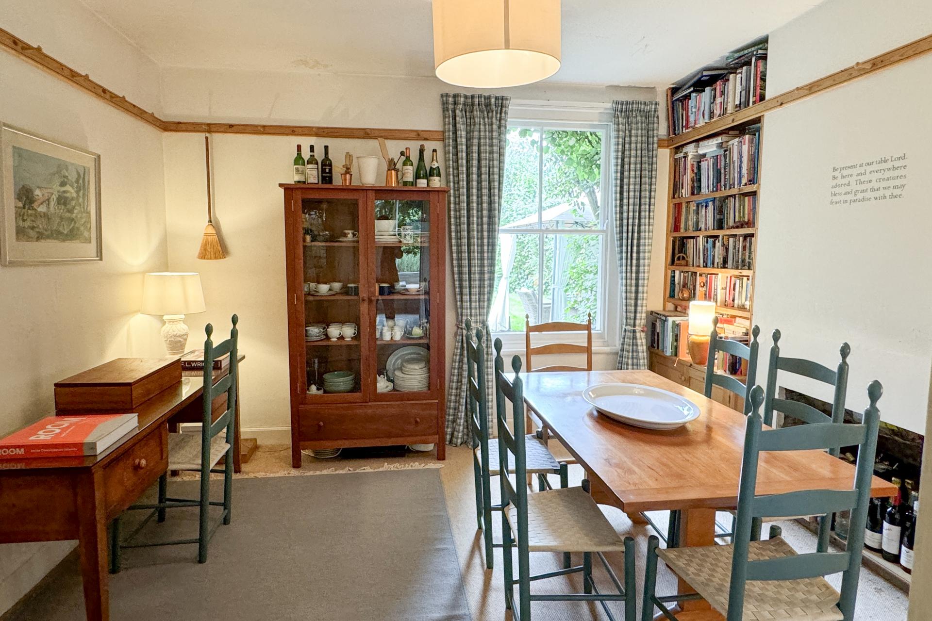 Adjacent to the sitting room, the dining room/study provides a serene retreat, with built-in shelving and garden views, perfect for those who work from home. Continuing through the hallway, you'll discover the heart of the home: the country-style kitchen, with bespoke solid wooden cabinets and an integrated double cooker. A cozy built-in seating area overlooks the garden, while a convenient downstairs cloakroom enhances the home's functionality. Ascending the stairs, three bedrooms await, with the master bedroom boasting ample natural light and built-in wardrobes. The family bathroom features a bath with shower over.