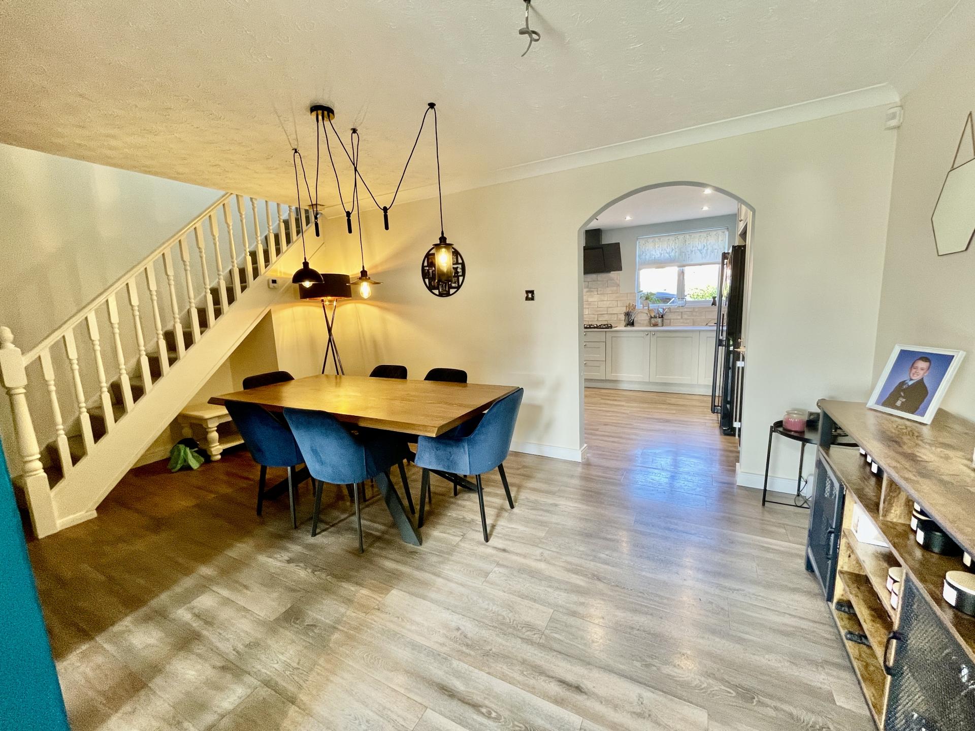 DINING ROOM: 17'8 x 10'9 (5.40m x 3.29m) Dual aspect fireplace opening to both lounge & dining room. Radiator. Stairs to first floor. Wood effect "Karndean" flooring. Opening to: