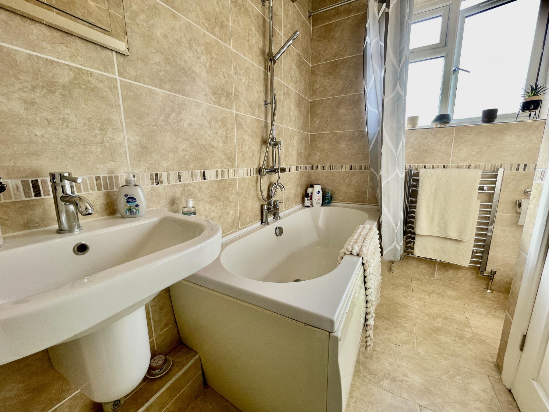 BATHROOM: Upvc double glazed window to the rear. Modern white suite comprising wc, hand basin plus bath with dual head shower unit. Chrome heated towel rail/radiator. Tiled walls. Tiled floor. Built in storage cupboard housing gas fired combi boiler.