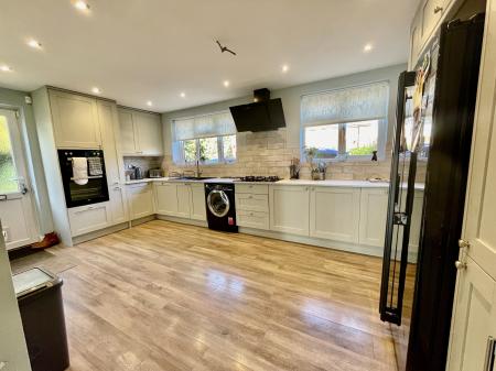KITCHEN/DINER: 17'8 x 10'5 (5.39m x 3.18m) 2 Upvc double glazed windows to the front. Refitted modern base units with work tops over and matching wall units. Inset composite sink and drainer with mixer tap. Integrated dishwasher, eye level double oven & 5 ring hob with extractor over. Spaces for American style fridge/freezer, slimline wine cooler and washing machine. Modern vertical radiator. Wood effect "Karndean" flooring. Built in understairs storage cupboard.