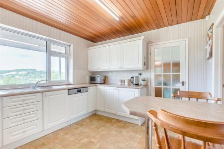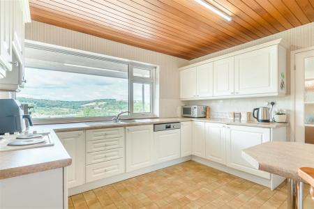 Kitchen / Breakfast Room - 3.43m x 3.12m (11'3 x 10'3) - Base and wall mounted units with laminated worktops and tiled splashbacks, single drainer stainless steel sink unit with mixer tap, integrated dishwasher and fridge, single radiator, built-in two seater breakfast bar, half glazed door to sun room, rear aspect picture window offering stunning views through the valley. Louvre doors into: