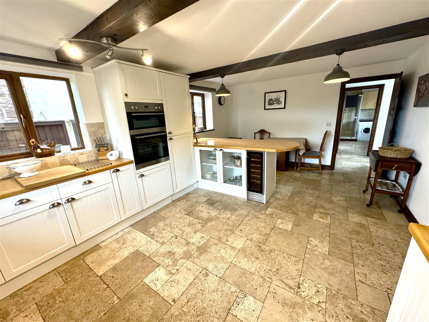 Kitchen/Diner - 5.89m x 3.73m (19'4 x 12'3) - Fitted kitchen to comprise of Belfast sink unit with cupboard under, mixer tap, range of base and wall mounted units, integrated double oven, four ring hob with cooker hood above, full height fridge, dishwasher, various cupboards and drawers, glazed display cabinets, spotlighting, tiled flooring, breakfast bar, wine fridge, underfloor heating, exposed ceiling beams, two side and one front aspect window, lovely outlook over surrounding fields. Access through to: