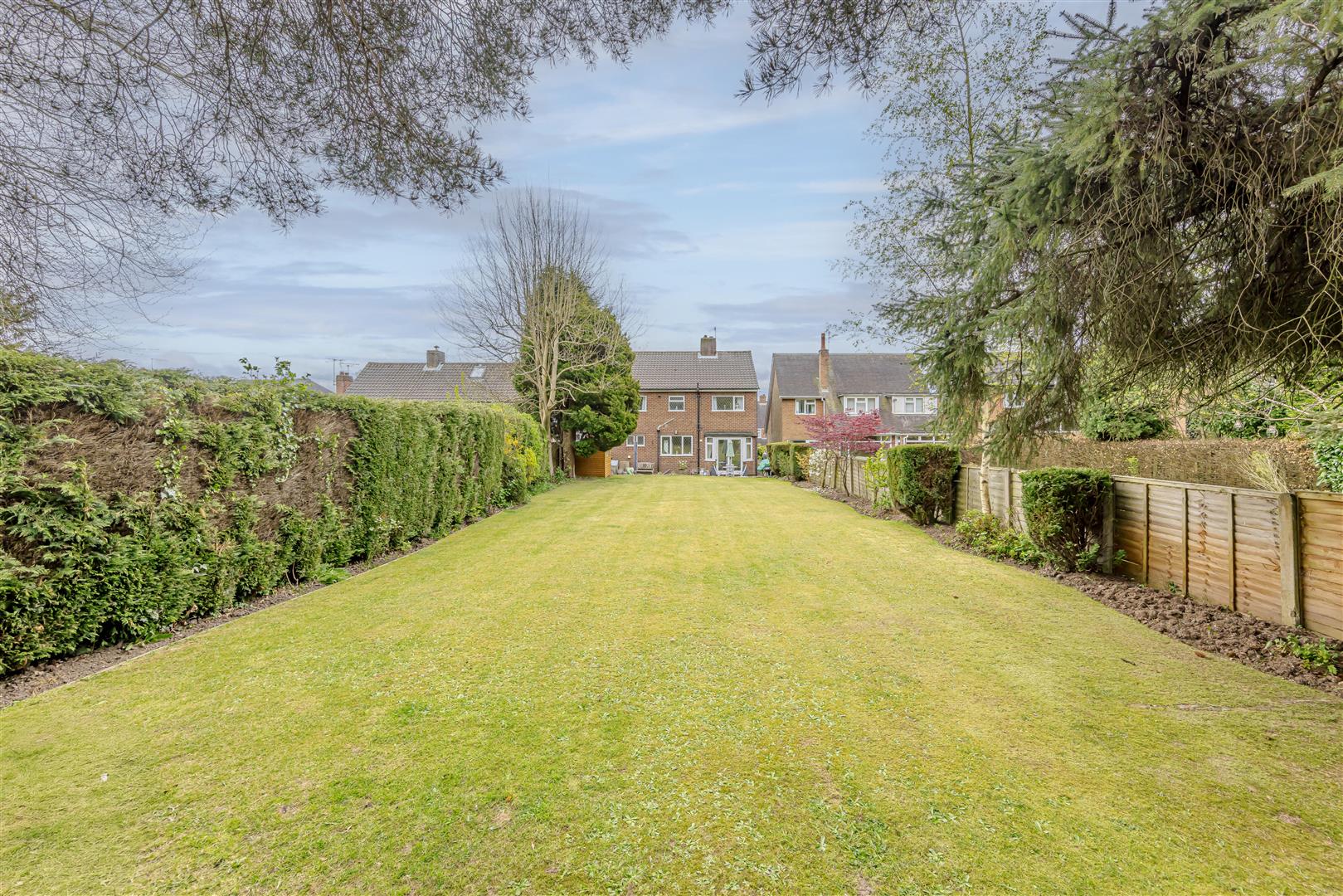 The front garden predominantly features a well-maintained lawn, complemented by flowerbeds, mature trees, and hedging. The rear garden includes a block-paved driveway that offers ample parking, along with an additional lawn area surrounded by mature trees and hedging.