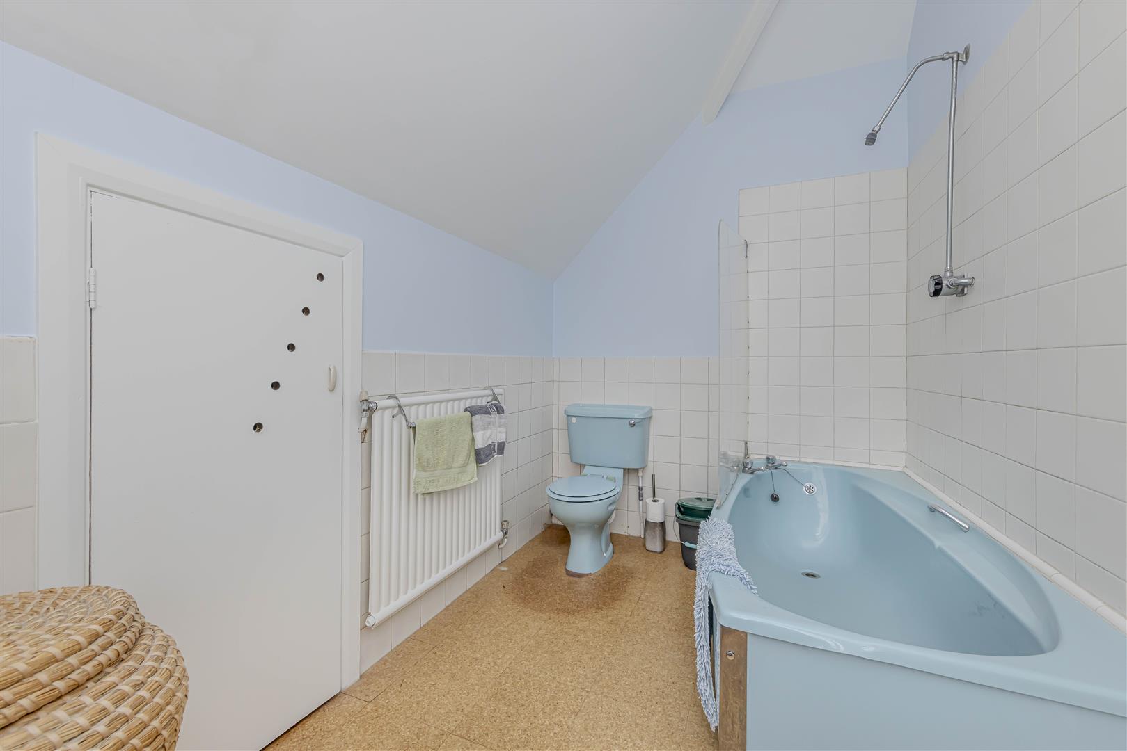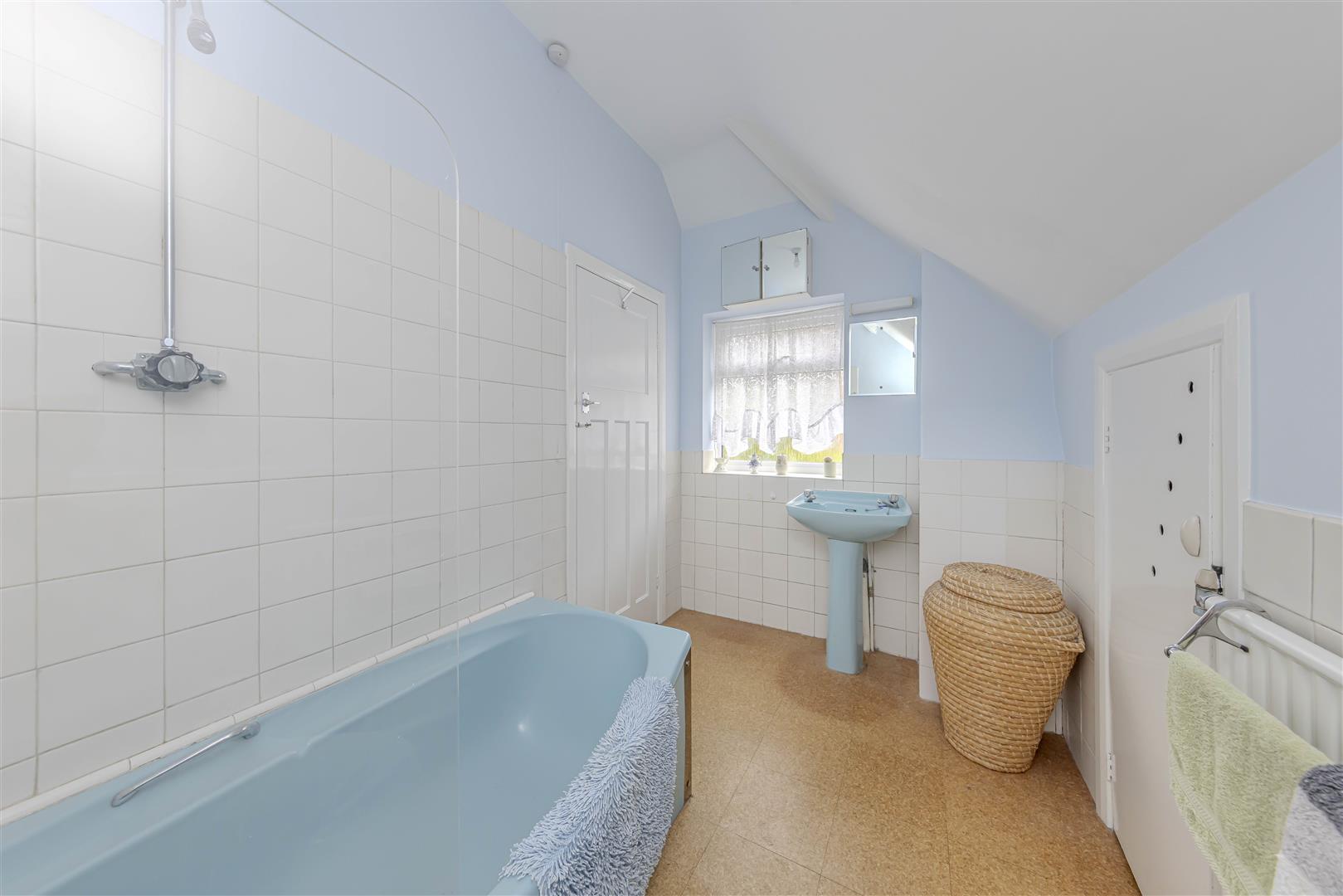Family Bathroom - 1.87 x 3.03 (6'1" x 9'11") - Contains a bath with shower attachment, WC, radiator, pedestal wash hand basin, part-tiled walls, ceiling light, and a uPVC frosted window to the side.