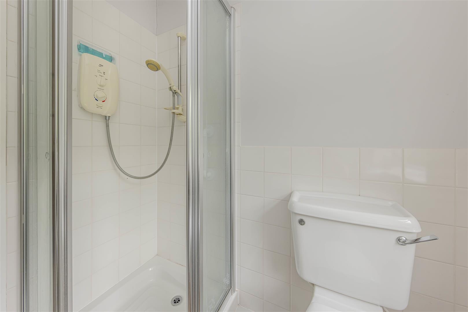 En-Suite - 1.44 x 1.81 (4'8" x 5'11") - Features a white suite including a wash hand basin, WC, shower cubicle with electric shower, radiator, uPVC frosted double-glazed window to the rear, extractor fan, and ceiling light