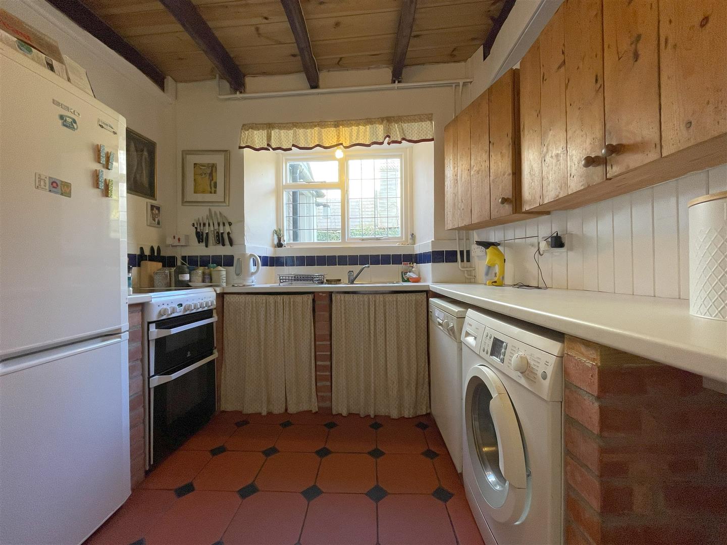 The ample sized kitchen is well-appointed with terracotta tiled flooring, electric oven and wall and base cupboards provide plenty of storage. There is space for an upright fridge freezer and plumbing for a washing machine and the oil boiler is located under the worksurface. The window looks out to the rear patio garden and, from the kitchen, a door opens to a useful utility room/ larger cupboard which has space and power for a tumble dryer.