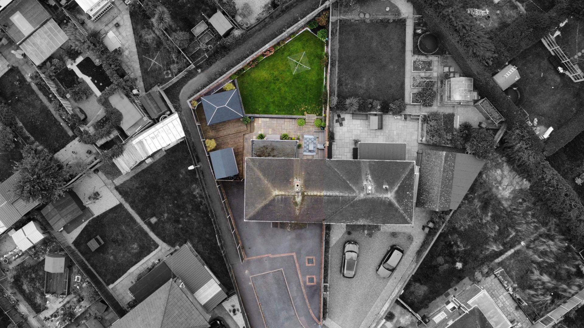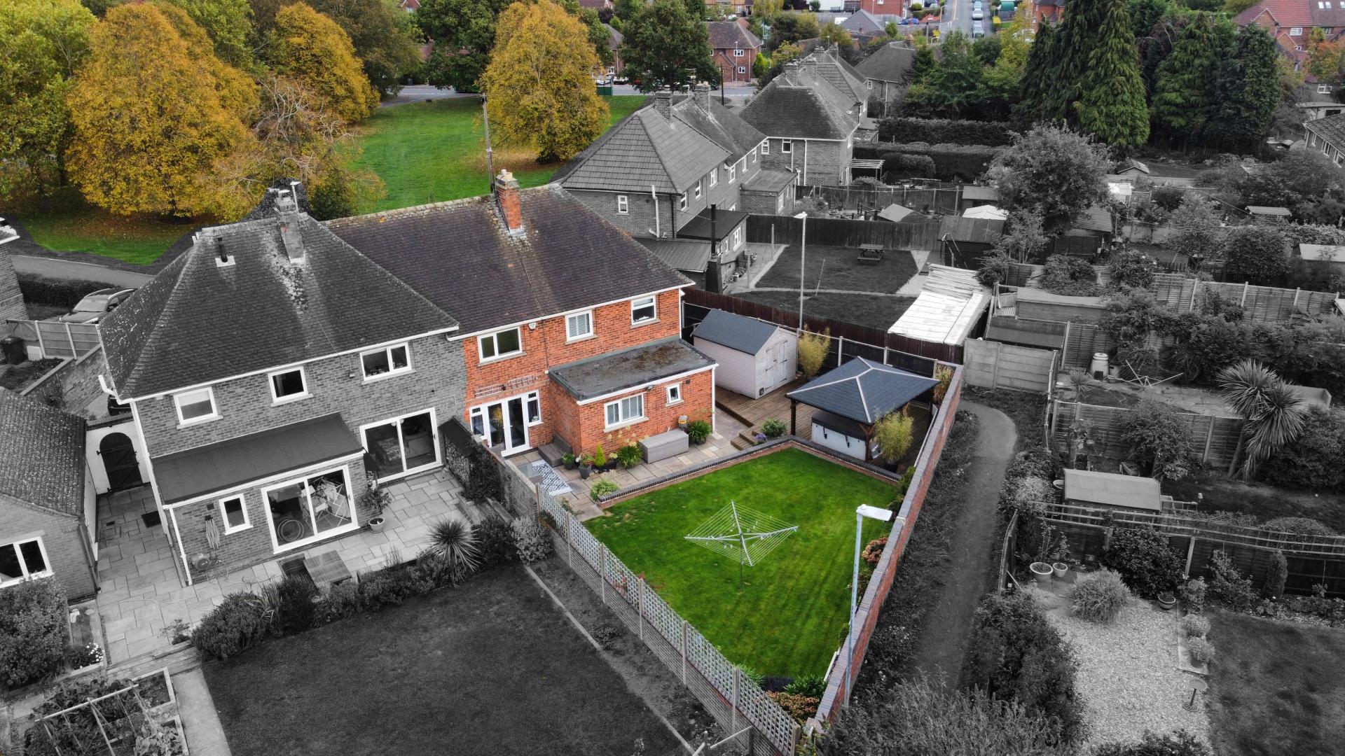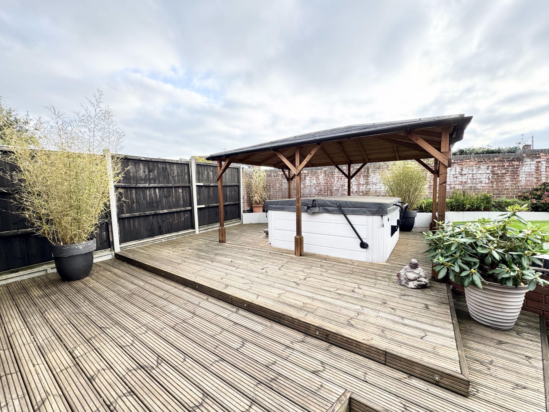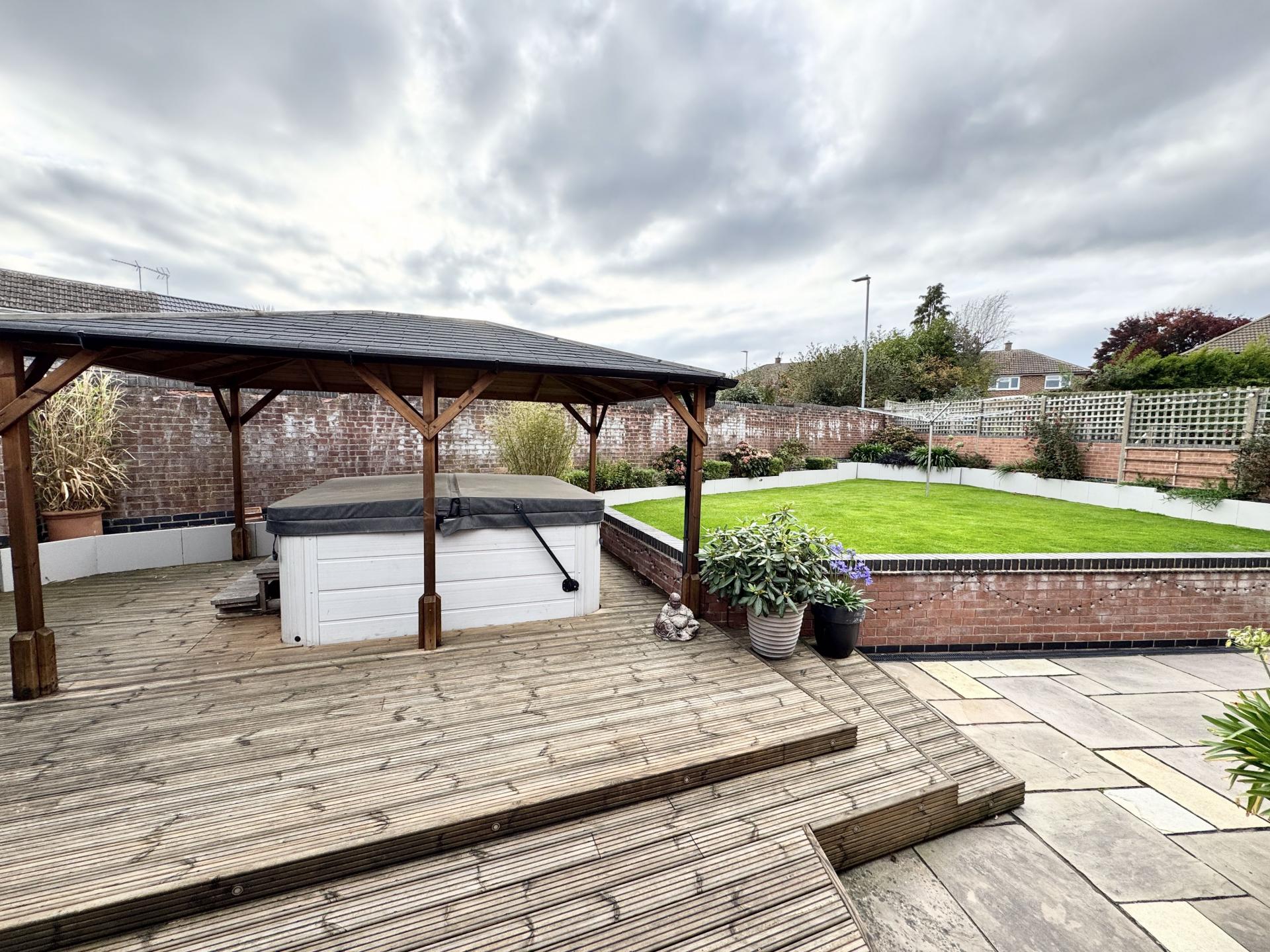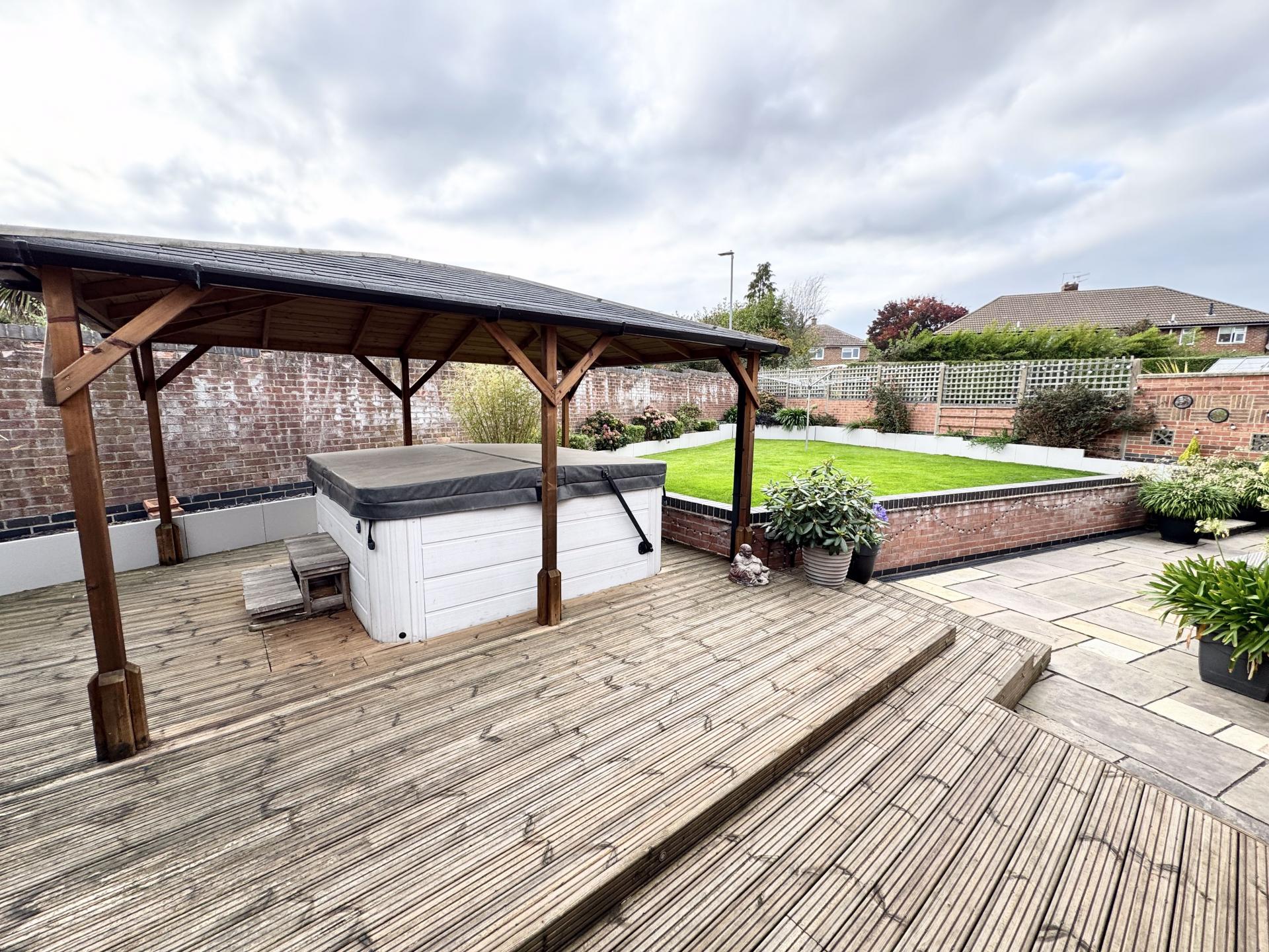 With a raised lawn area with raised flower beds, patio area with outdoor power sockets, decking area with sunken hot tub (included in the house sale) with pergola over and a wooden shed with power and lighting
