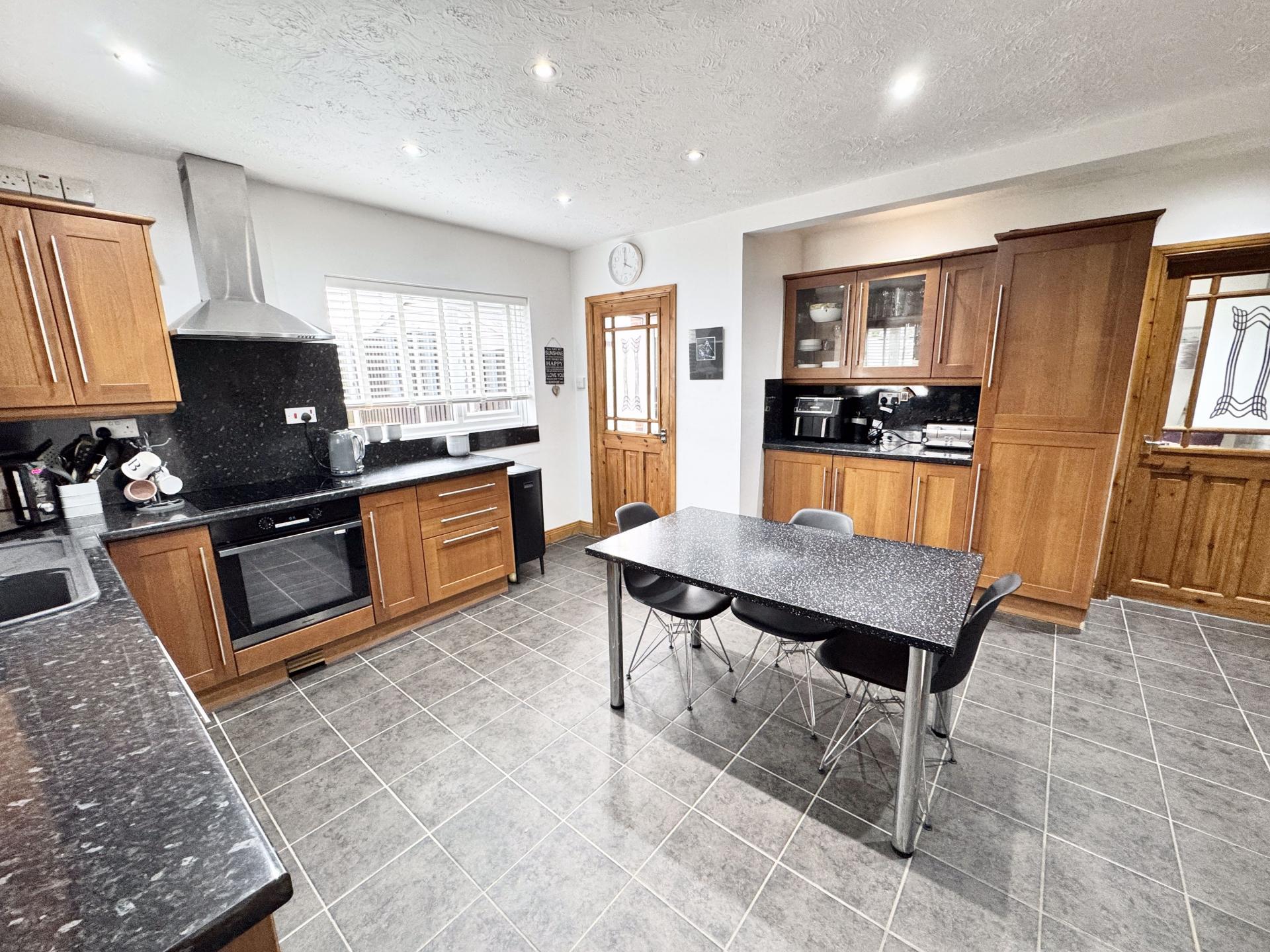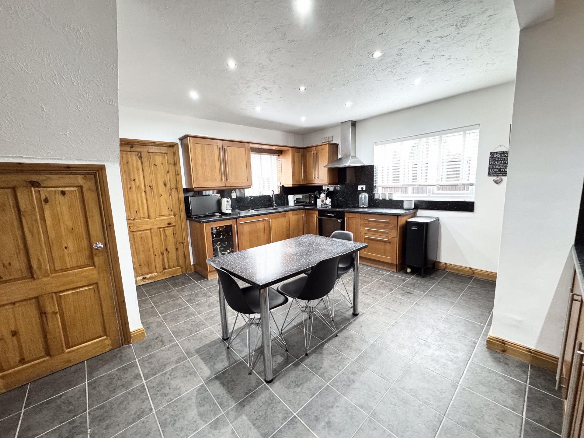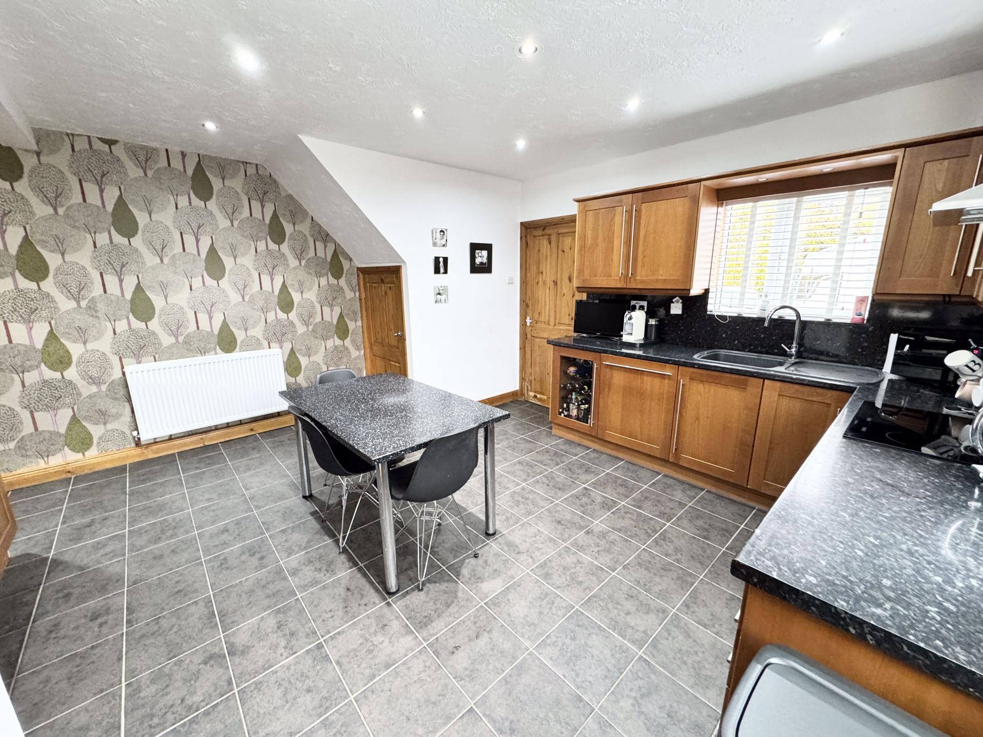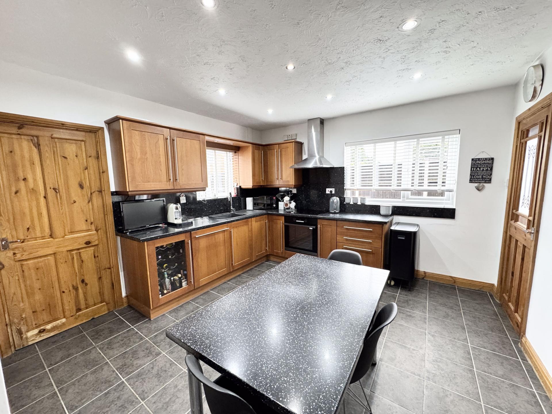 The kitchen is fitted with a range of wall and base units, sink and drainer unit, electric oven, electric hob with extraction hood over, integrated dishwasher and fridge freezer, wine rack, LED downlights, a radiator, understairs storage cupboard and uPVC windows to the front and side elevation