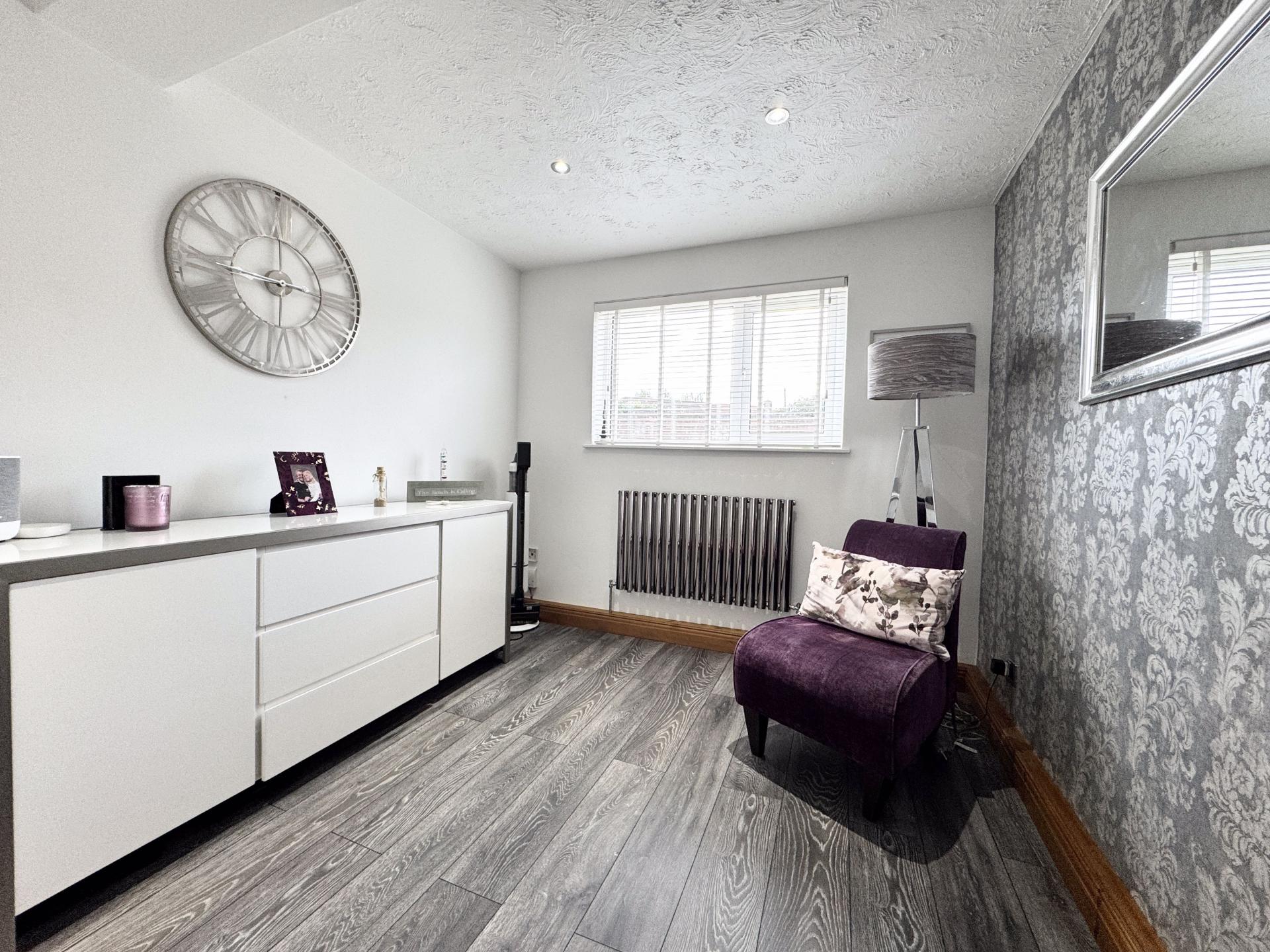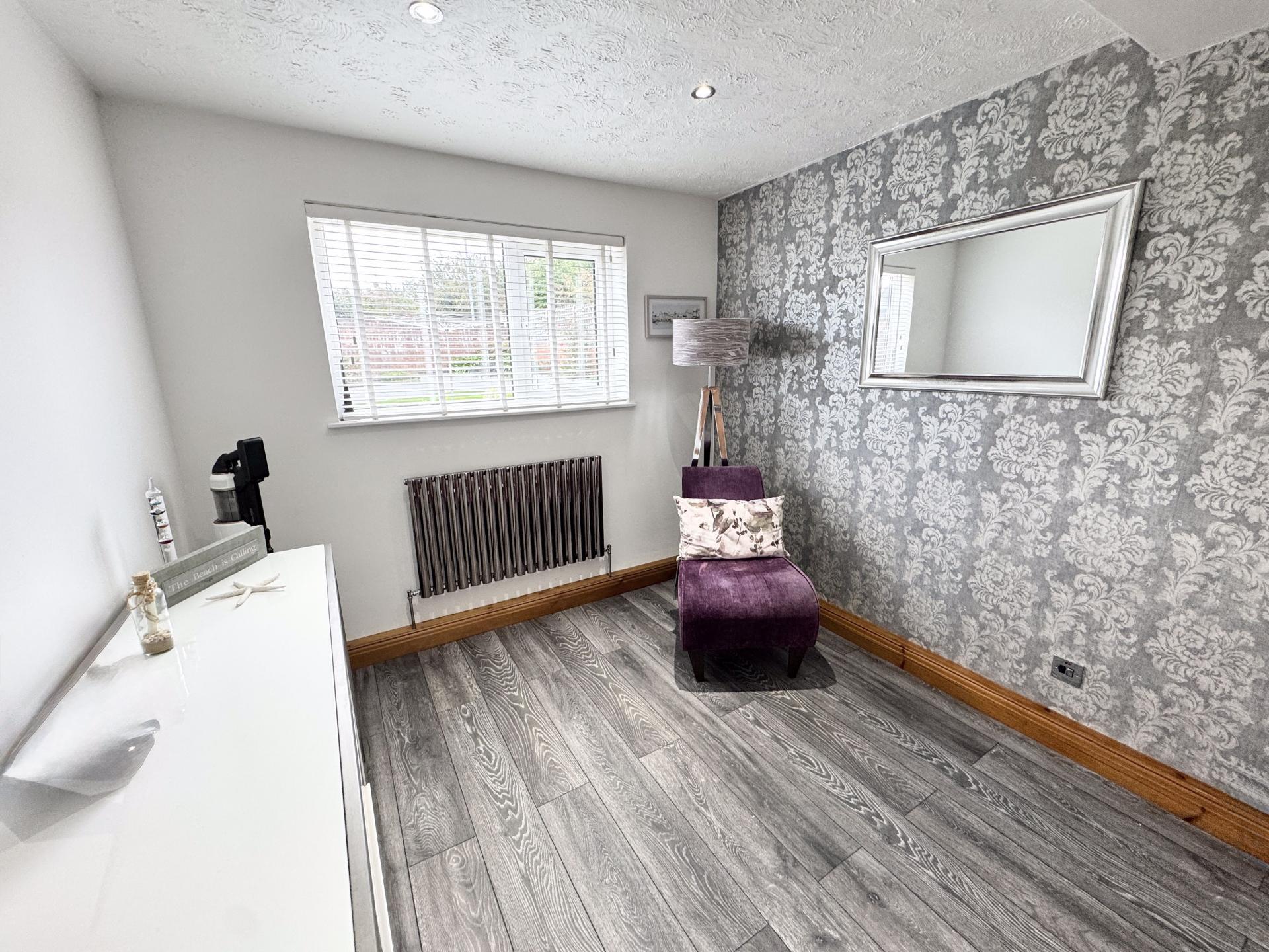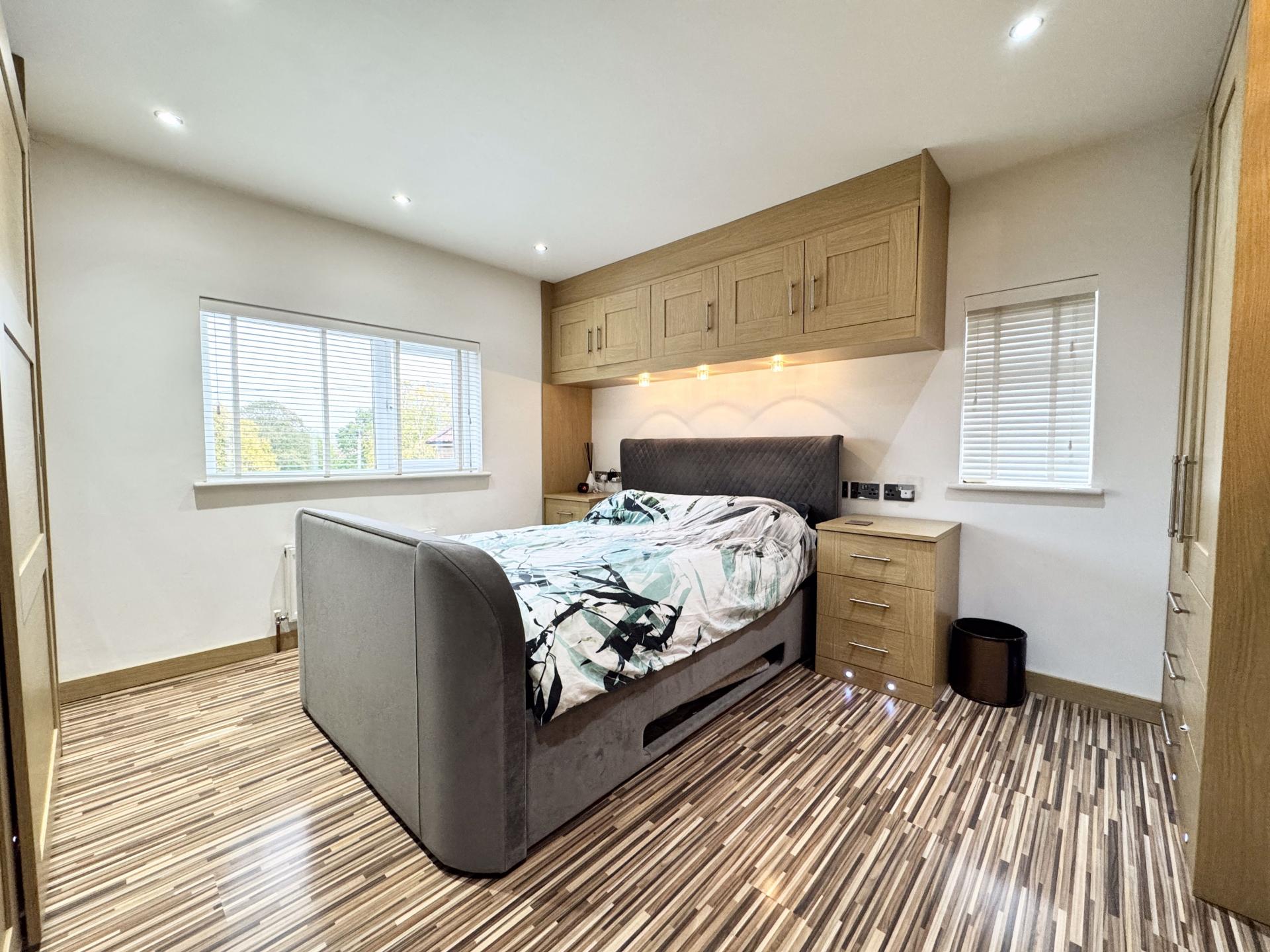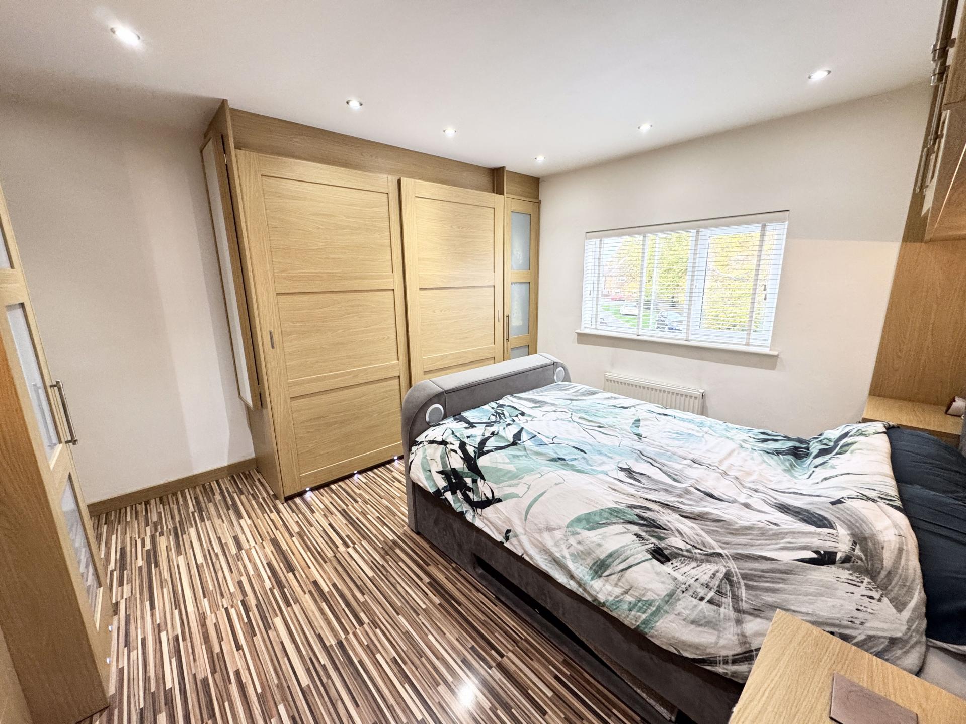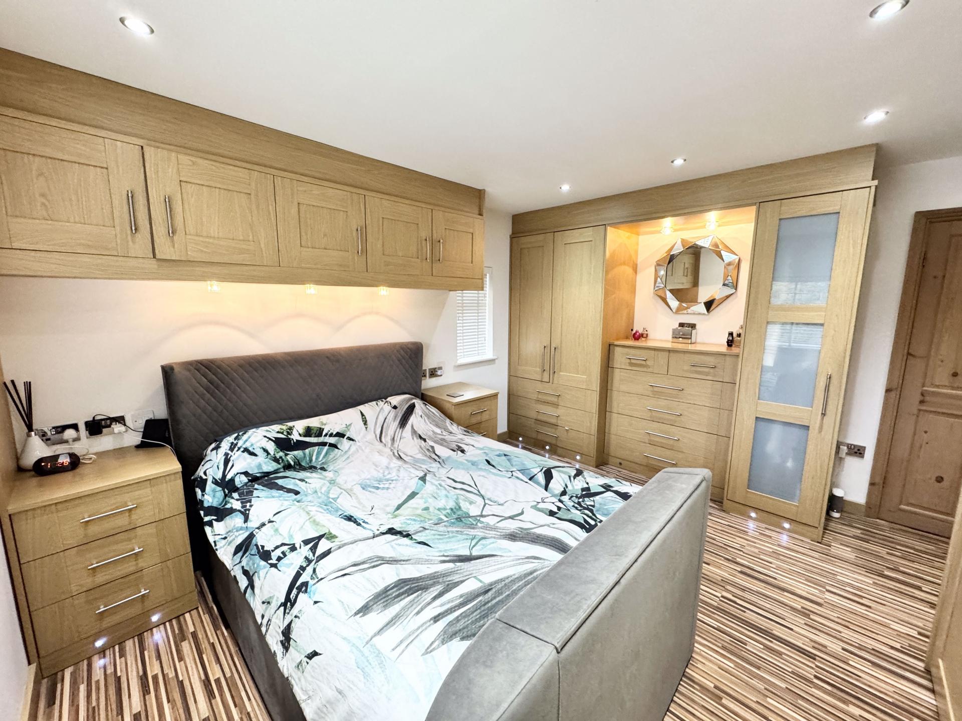 With a uPVC window to the front and side elevation, a radiator, fitted wardrobes with sensor lights and LED spotlights, fitted drawers and a matching airing cupboard housing the gas central heating combination boiler