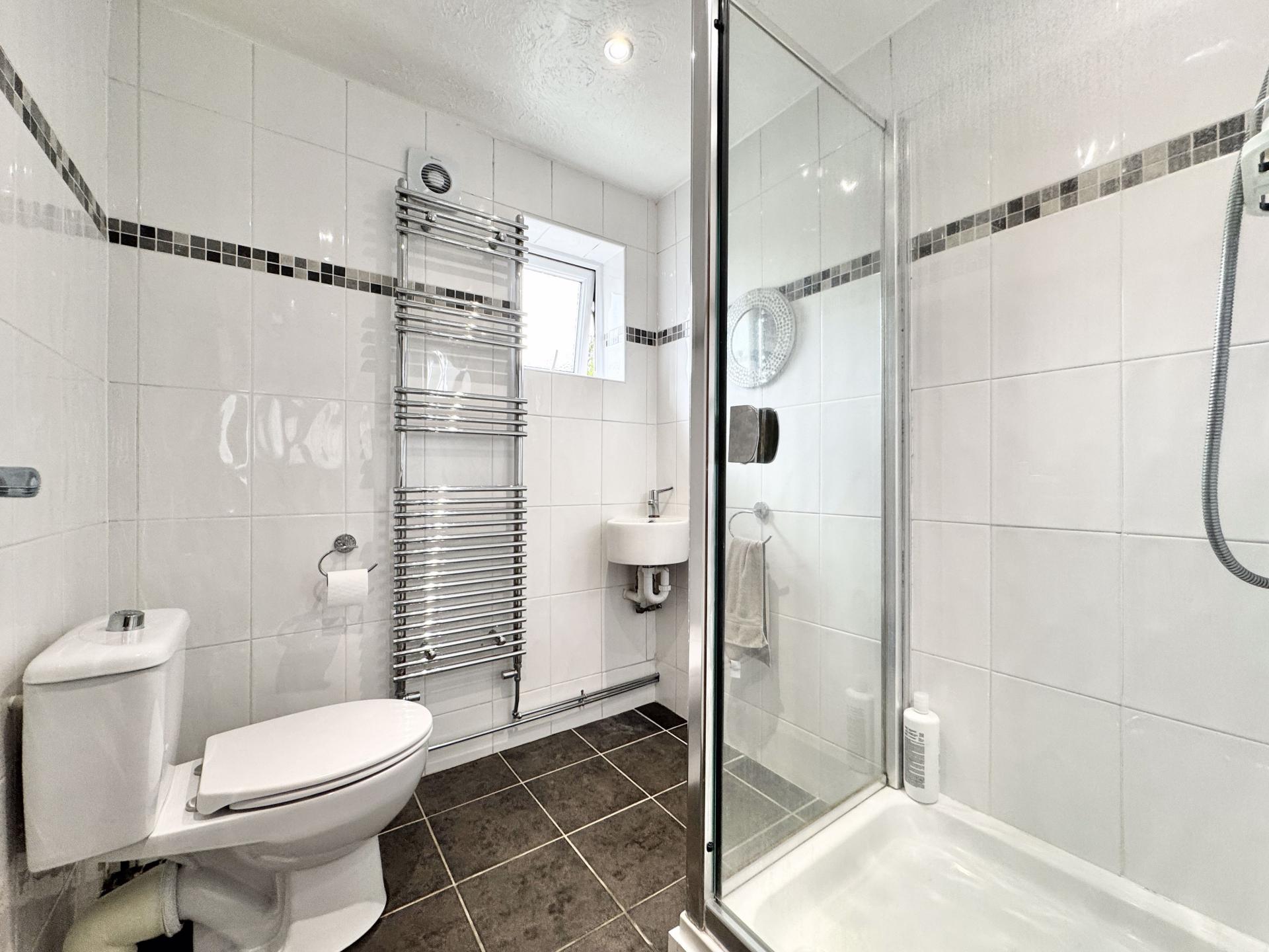 Three piece suite comprising of a corner shower cubicle, low level WC, wash hand basin, heated towel rail and a uPVC window to the rear elevation