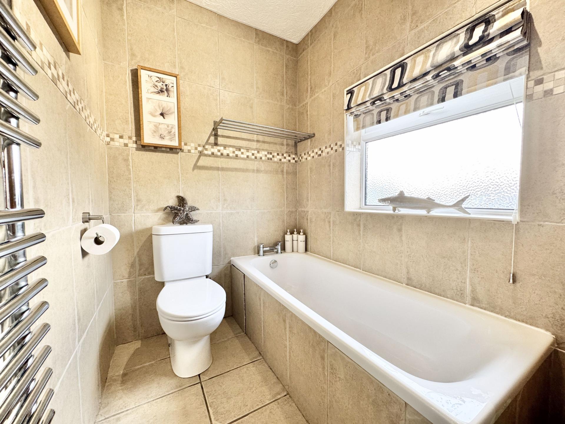 Three piece suite comprising of a panelled bath, low level WC, wash hand basin vanity unit, a radiator and a uPVC window to the rear elevation